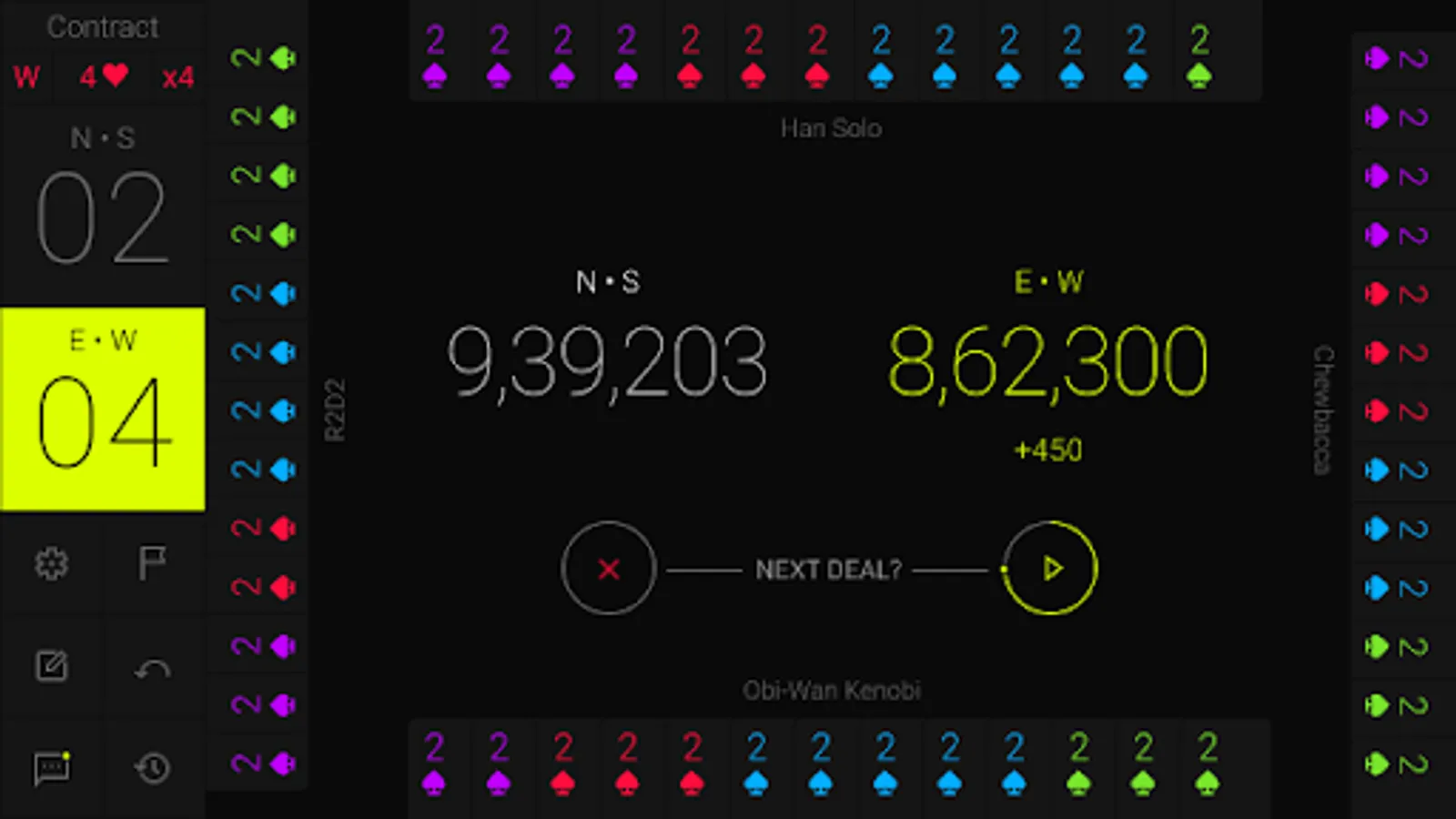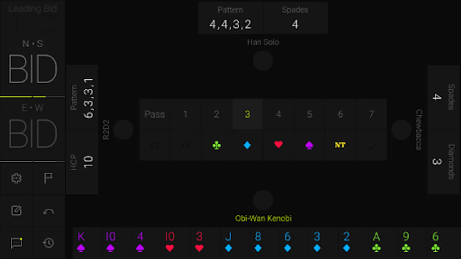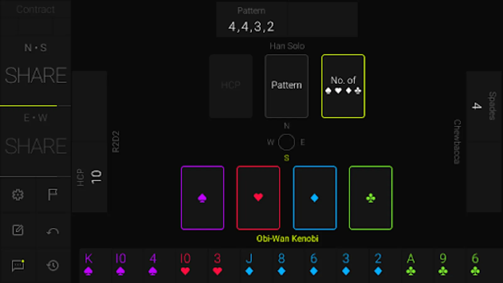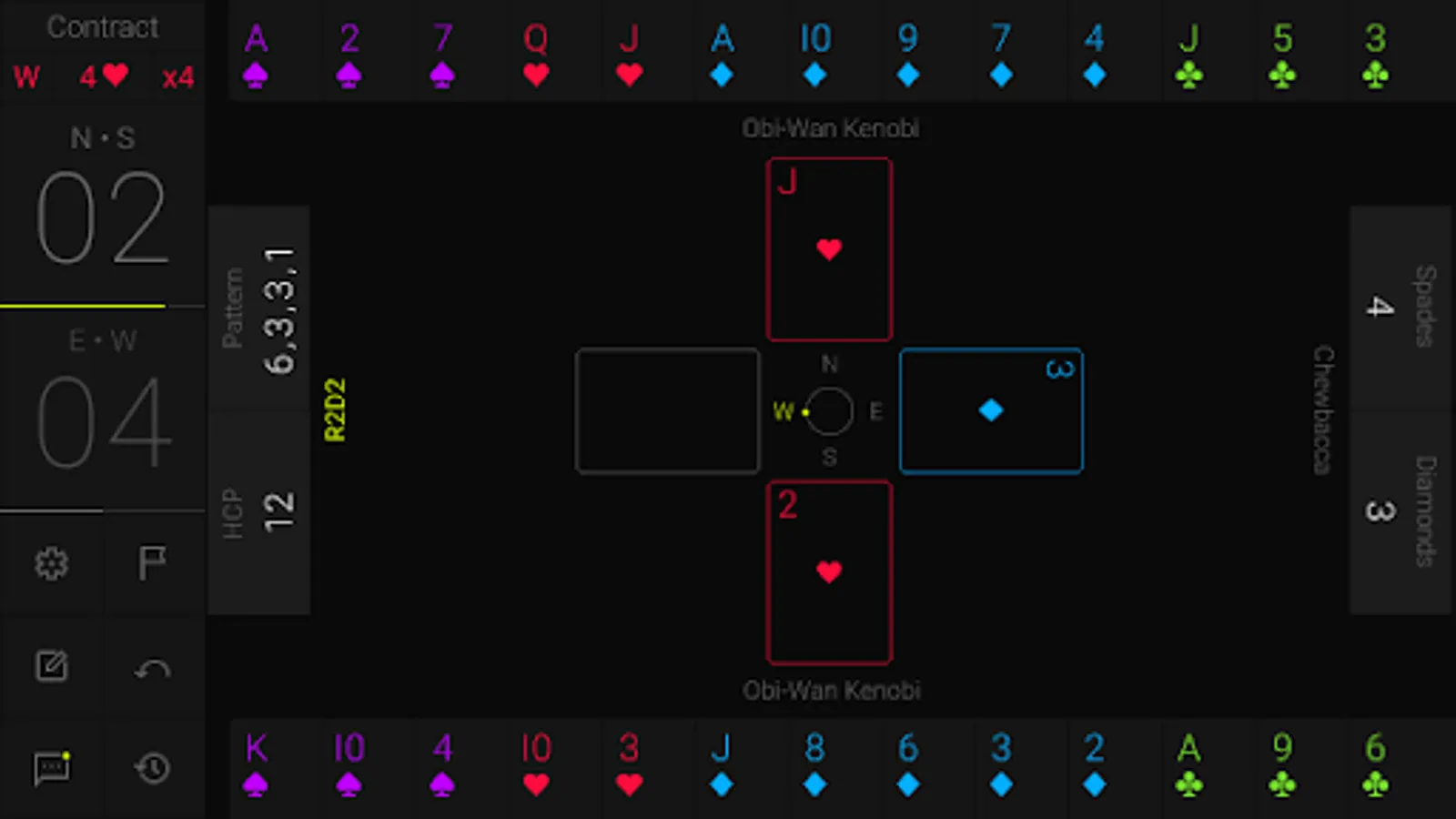 HOOL is a card game played by 4 players sitting in North, East, South and West seats. North and South are partners playing against East and West. The game goes in three stages. In the first stage, all players share two pieces of information about their hand. In the second stage, there is an auction to determine which player has bid the highest (for the total number of tricks and whether in Trump or No Trump). The highest bidder is known as the declarer. The third stage is the play of the cards where the declarer tries to make his contract while the defenders try to deny him.