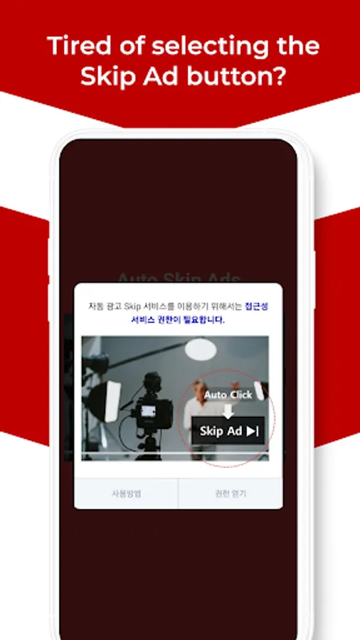 Select “Settings” menu ▶ Select “Accessibility” menu ▶ Select service menu and activate Auto Skip Ads service