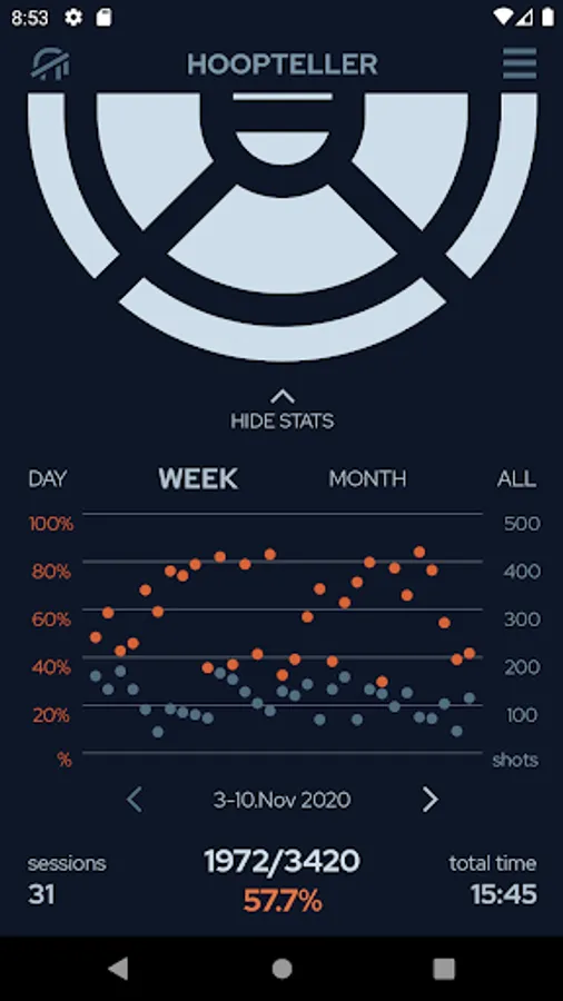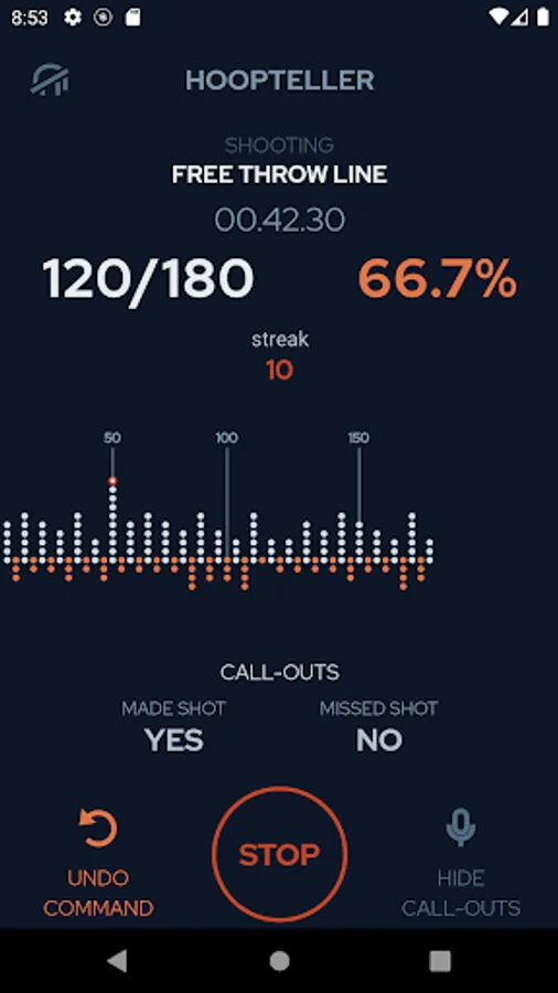 Hoopteller is the easiest to use basketball shot tracker on the market; all you need is headphones with a microphone. We use AI on the phone to listen for voice commands, which communicate made and missed shots.