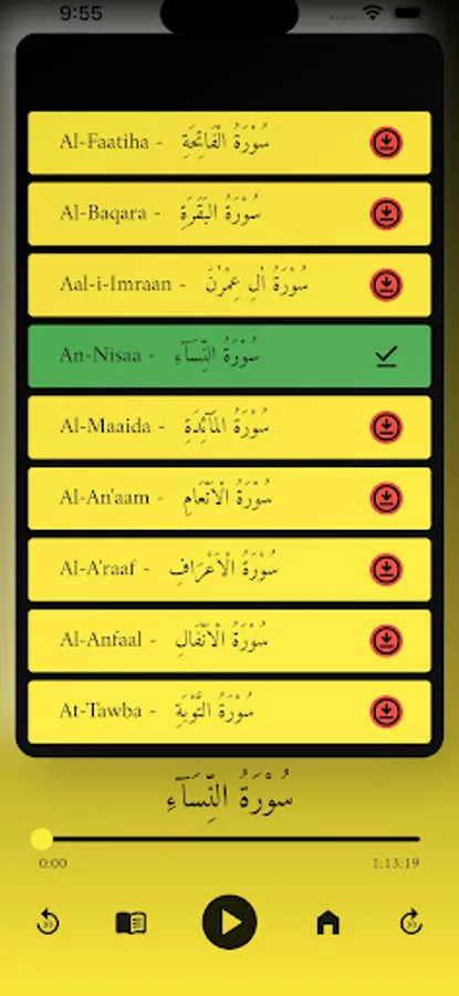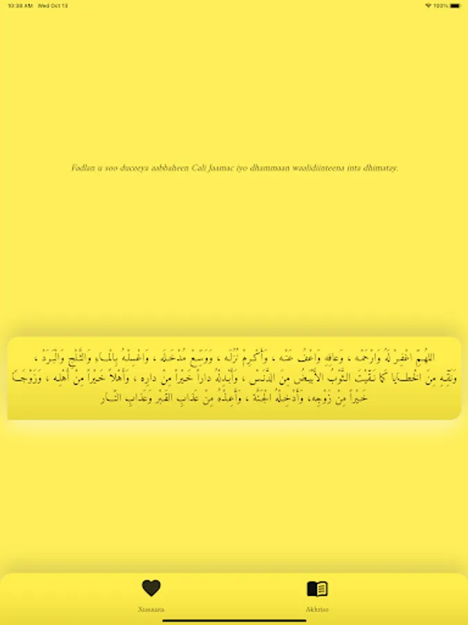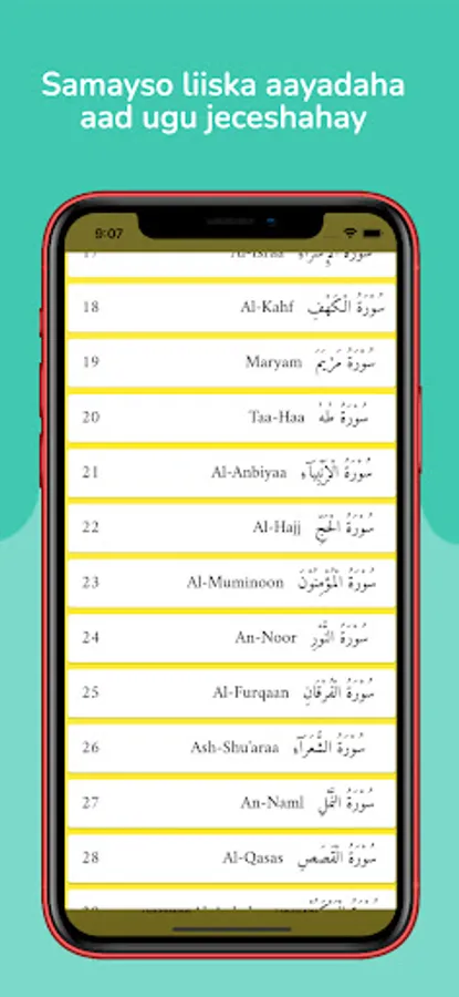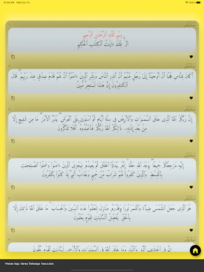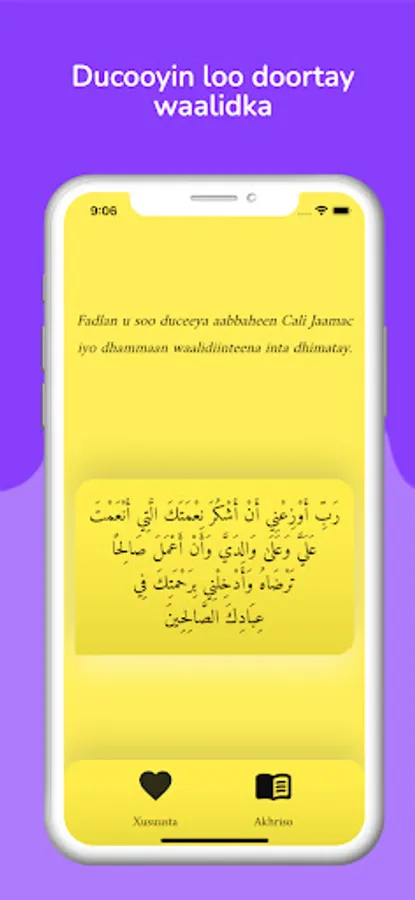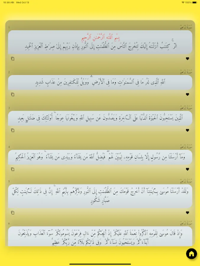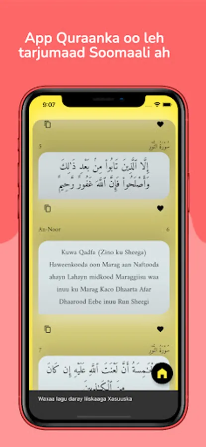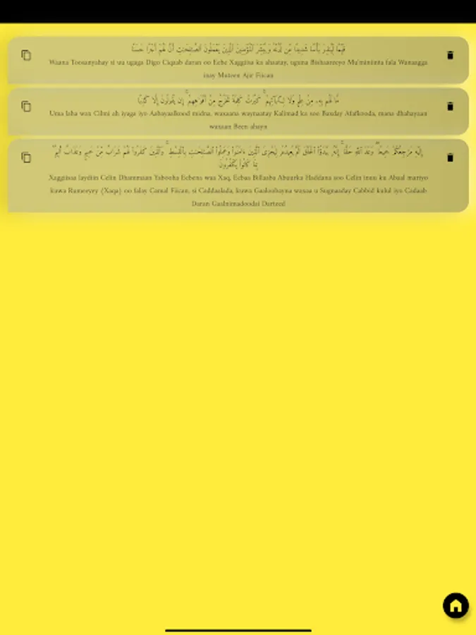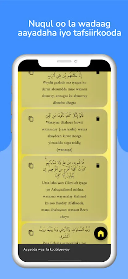 Apka wuxuu kuu oggolaanayaa inaad nuqul ka dhigto ama koobiyayso aayad kasta iyo tarjumaaddeeda oo aad la wadaagto qoyska iyo saaxiibbada.