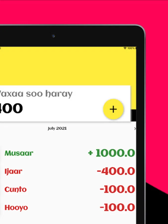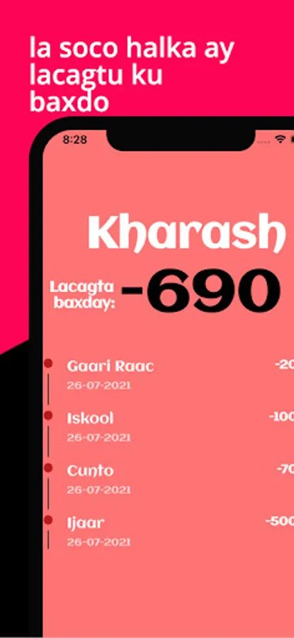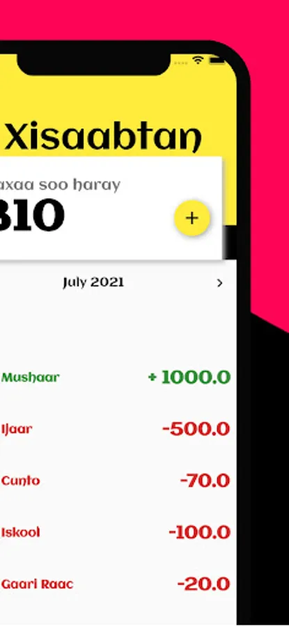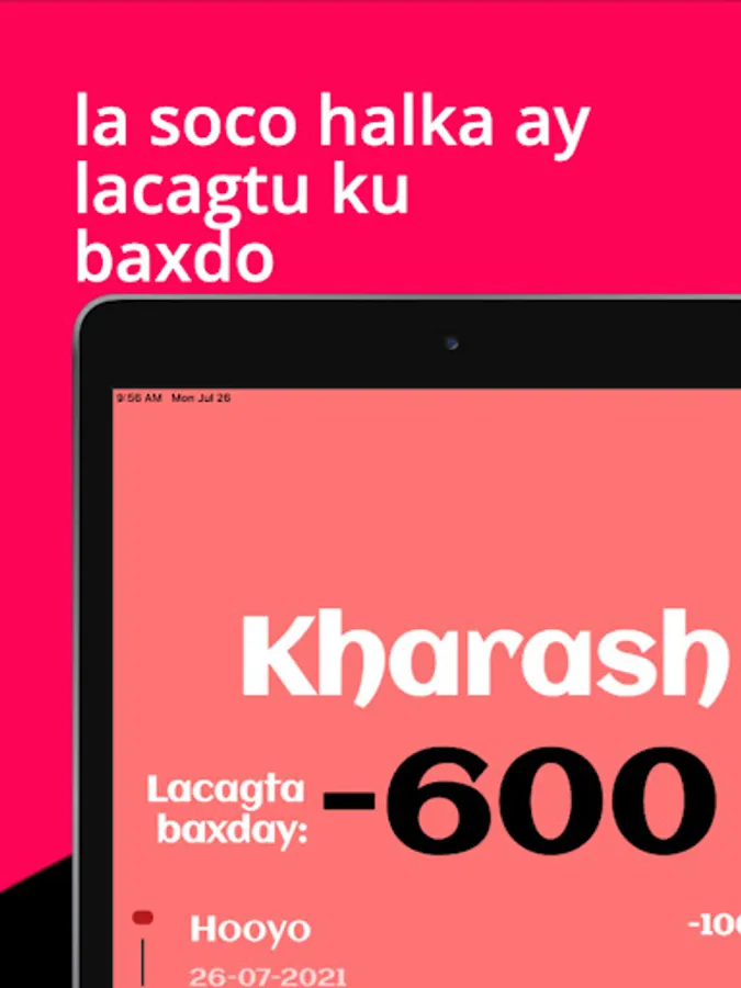 Maareynta maaliyadda shaqsiyadeed ma sahlana. waxyaabo badan oo aan maalin walba lacag ku isticmaalno ayaa jiro. Mararka qaar kama war qabno inta aan lacag ku bixineyno waxyaabaha aan muhiimka aheyn. Waxaan badanaa isweydiineynaa sababta dakhligeenu uusan marna nagugu filnayn. Waxaa la joogaa waqtigii aan dib ula soo noqon lahayn maamulida kharashkeena. U adeegso Xisaabtan APP sidii raadraacaaga lacagtaada. Isla markaana saadaalin kara kharashkaaga bilood ee soo socota iyadoo lagu saleynayo caadadaadii hore ee lacag bixinta.