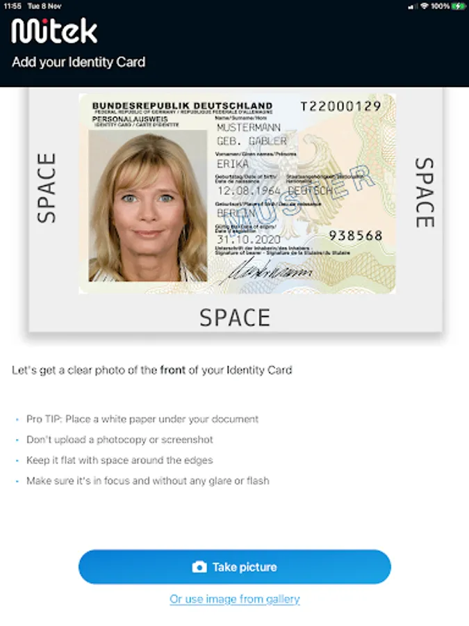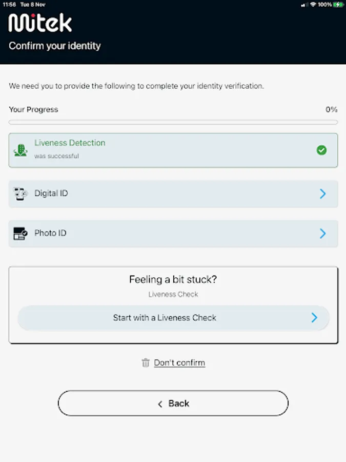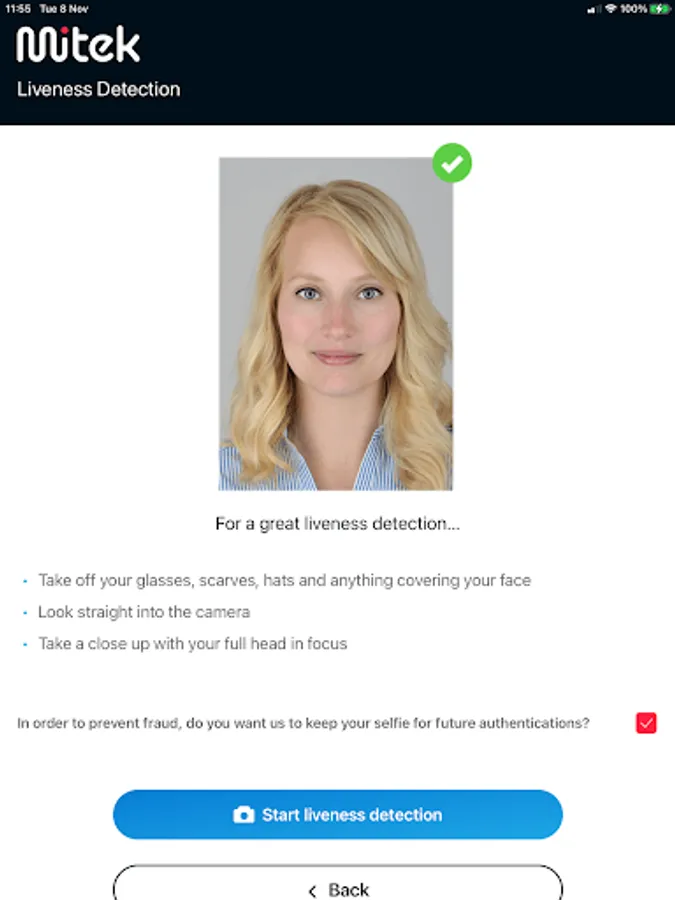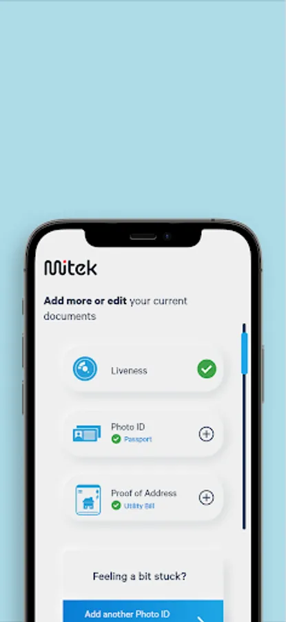 The Mitek app allows you to verify your identity and prove who you are through linking your face to your government-issued photographic identity documents, like a passport or driving license. Your identity details are then stored safely and securely on your device so that you can re-use them again in the future.