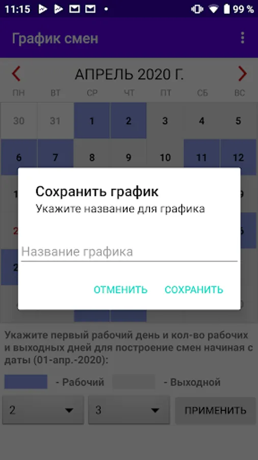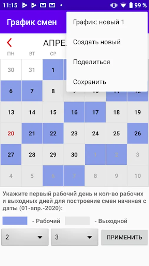 You yourself build your work schedule and mark the dates on which you have a shift or a weekend.