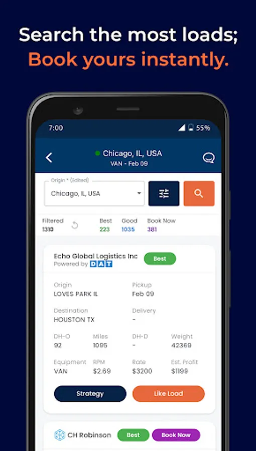 Our app gives you complete control over the loads you book, while helping you plan longer-term strategies that help you earn more, more efficiently.