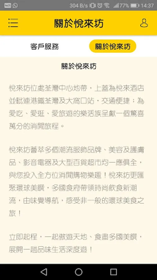 悅來坊薈萃多個潮流服飾品牌、美容及護膚品、影音電器及大型百貨超市均一應俱全,與您投入全方位消閒購物樂趣!悅來坊更匯聚環球美饌,多國食府帶領時尚飲食新潮流,由味覺導航,感受非一般的環球美食之旅!