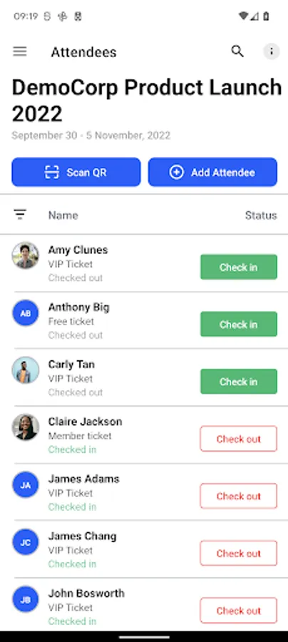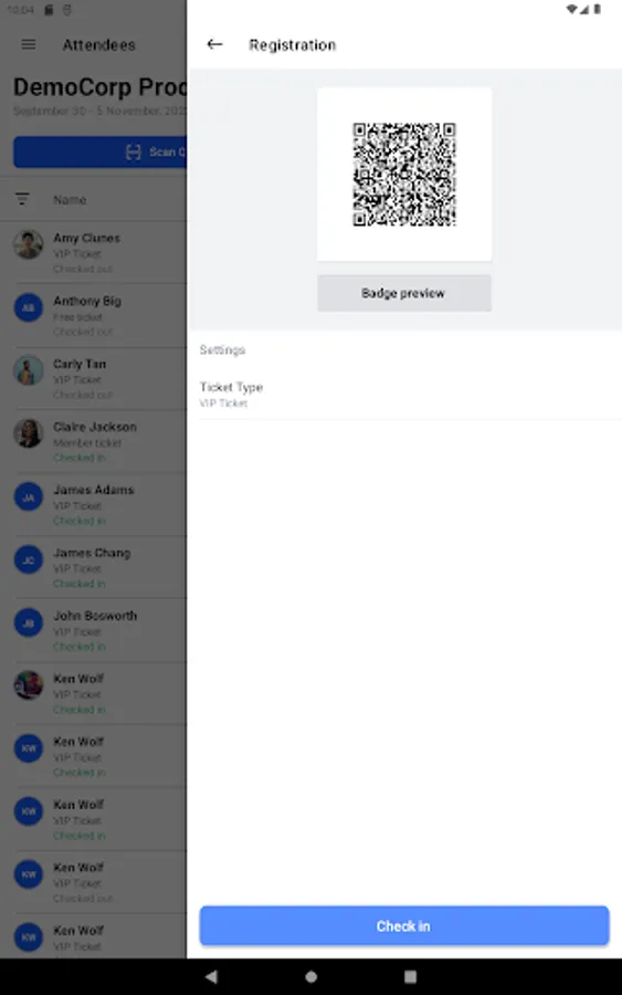 - Scan QR codes from registration confirmation emails for contactless check-in