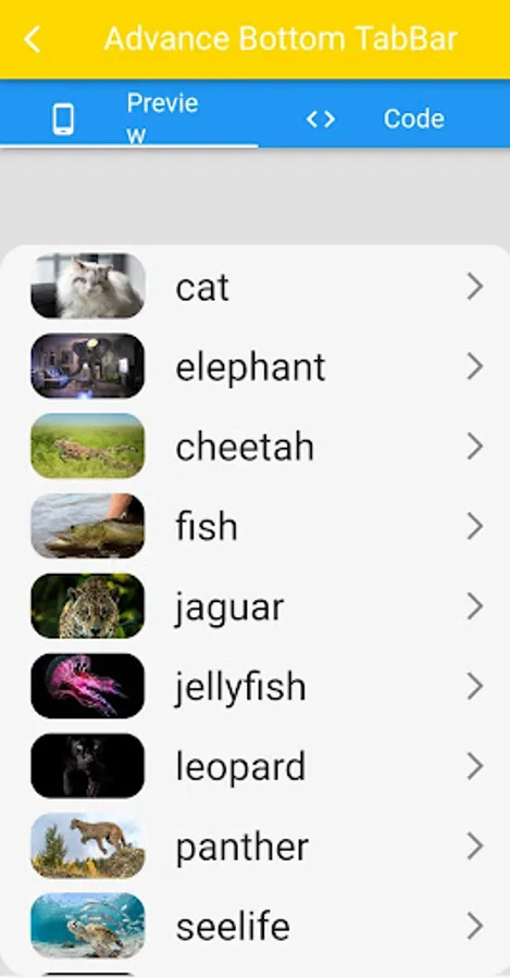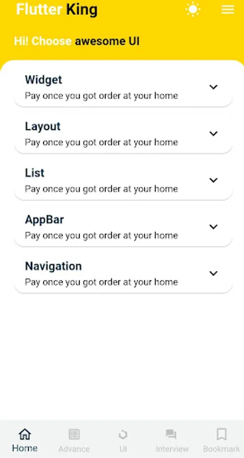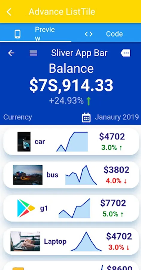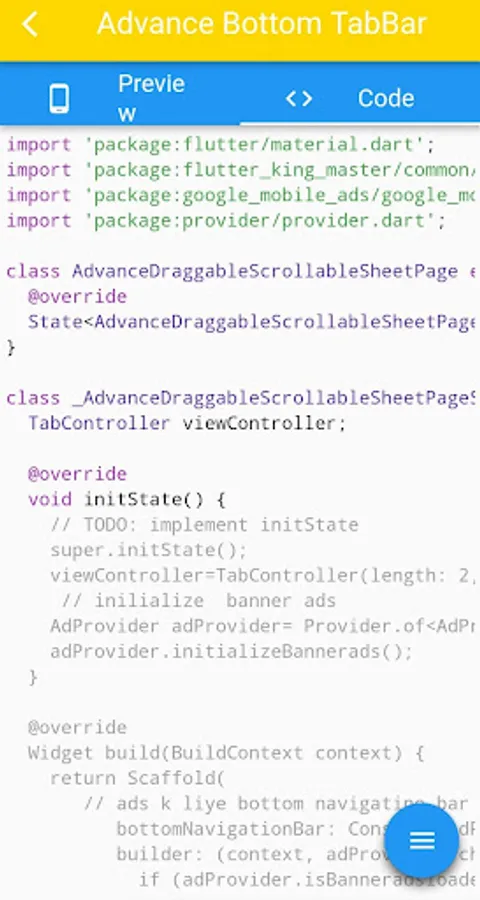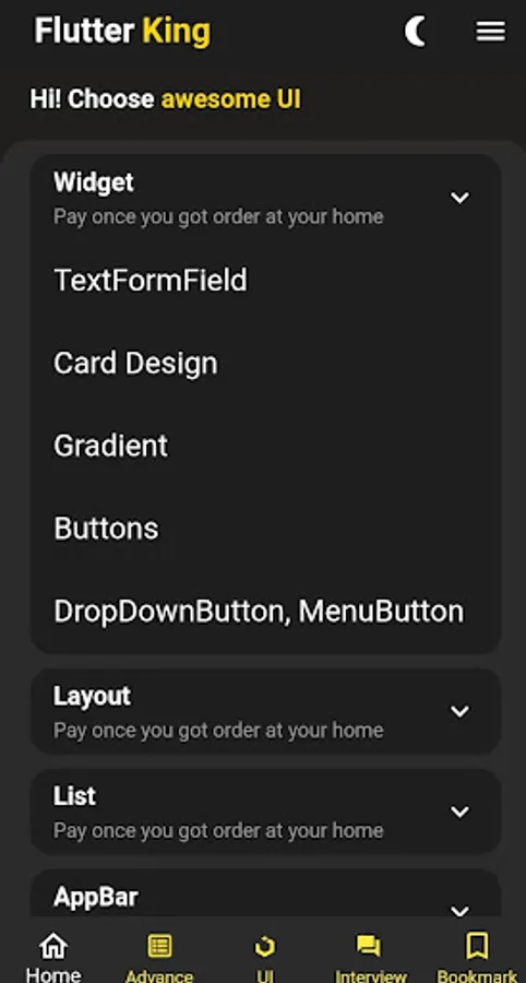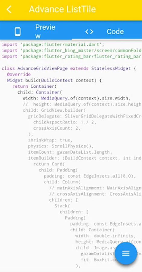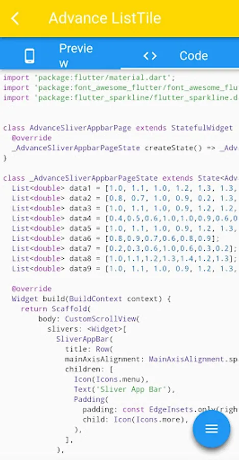 Click on list items of home page to see different Flutter components, the source code is just besides the previews.