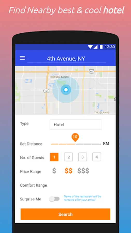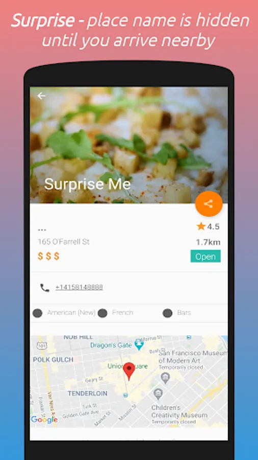 Select the SURPRISE button to get discover a new place [Bar, Cafe, Hotel, Restarurant], Name of the place is kept surprise until you reached nearby