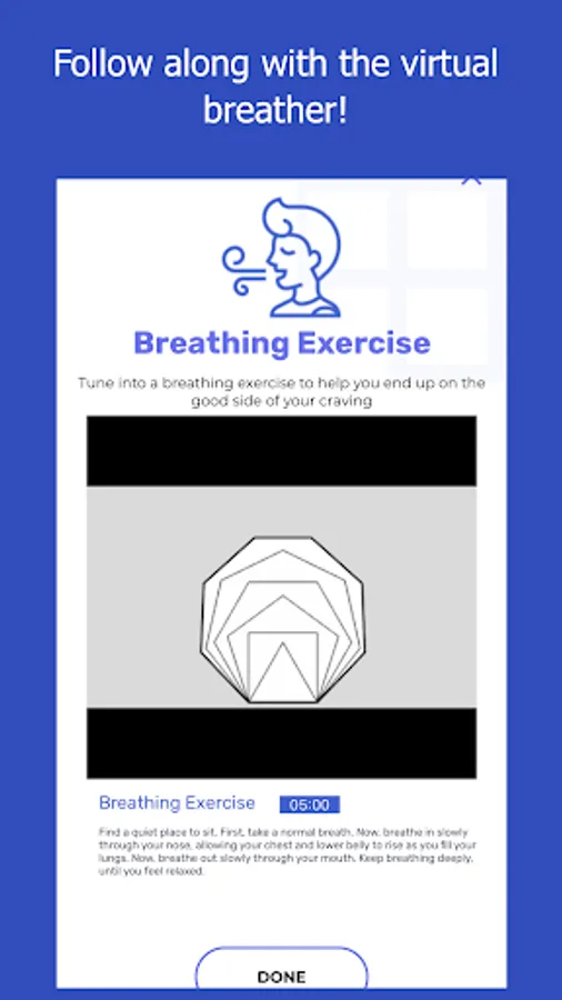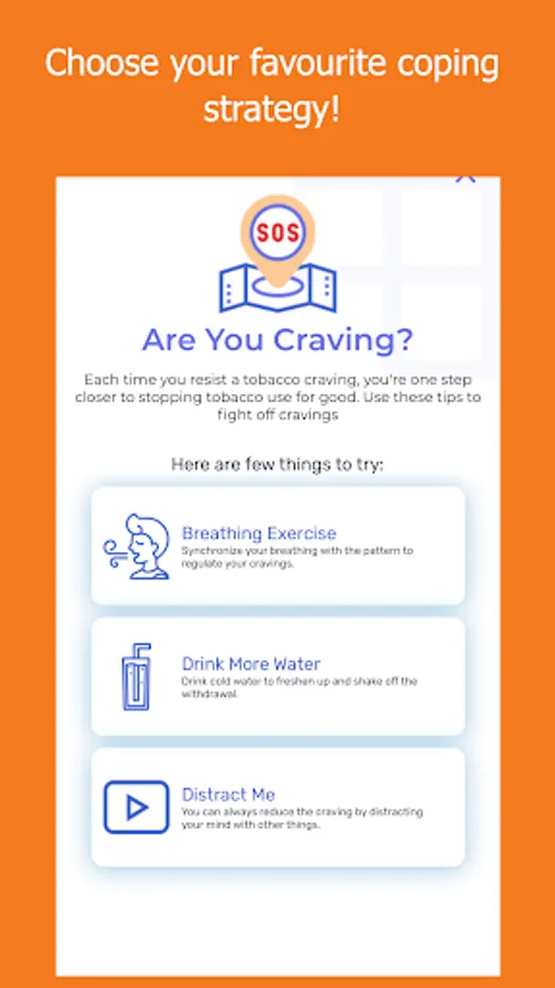 Evidence-based coping strategies: The app recommends the best evidence-based coping strategies to deal with your withdrawal symptoms. Take deep breaths with the guided video, drink water, or watch a funny video to distract yourself.