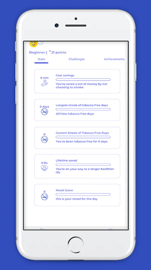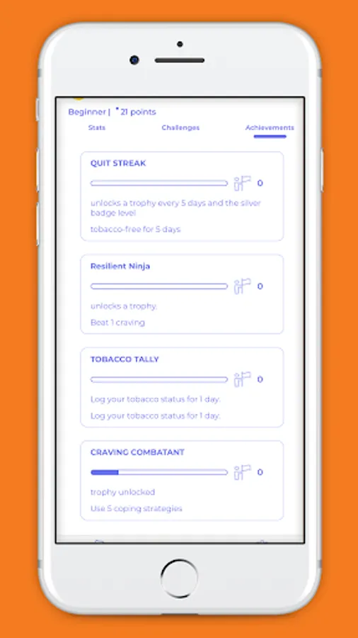 Achievements: View your achievements. Your trophy cupboard will start filling up the less you smoke and the more challenges you do. Admire it everyday.