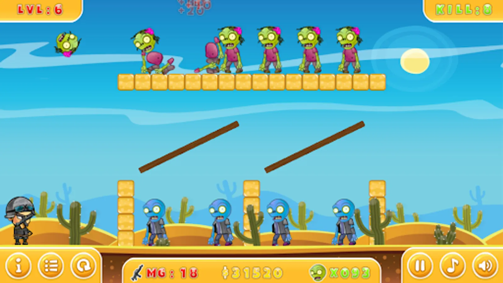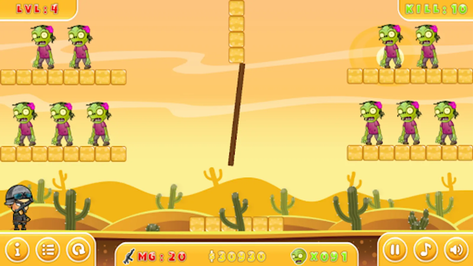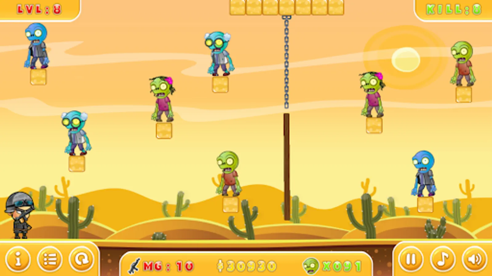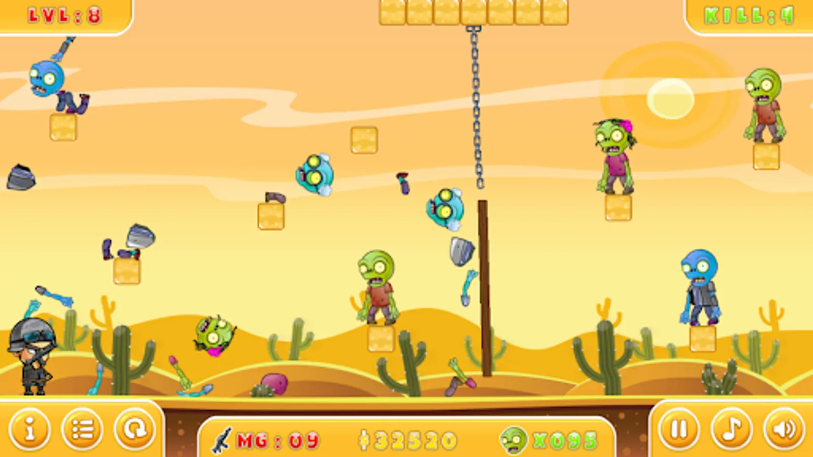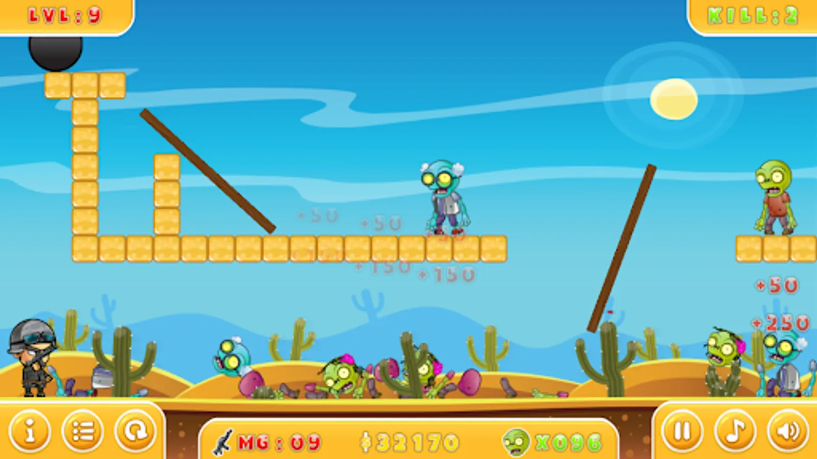 Defeat all zombies using limited bullets. You can only get rid of zombies by using the terrain and timing them well. Become a hero by clearing all levels!