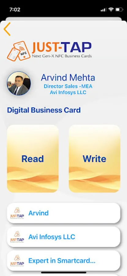 JUST- TAP NFC Business Smart card is a small portable computer, usually the size of a credit card, without a screen and keyboard. It integrates microprocessors, some memory, and several applications. Round metal contacts are very important to connect to the chip below and activate the card contact profile electronically.