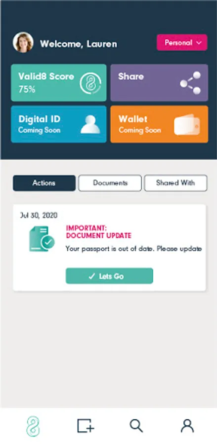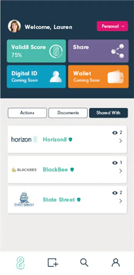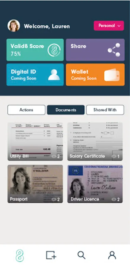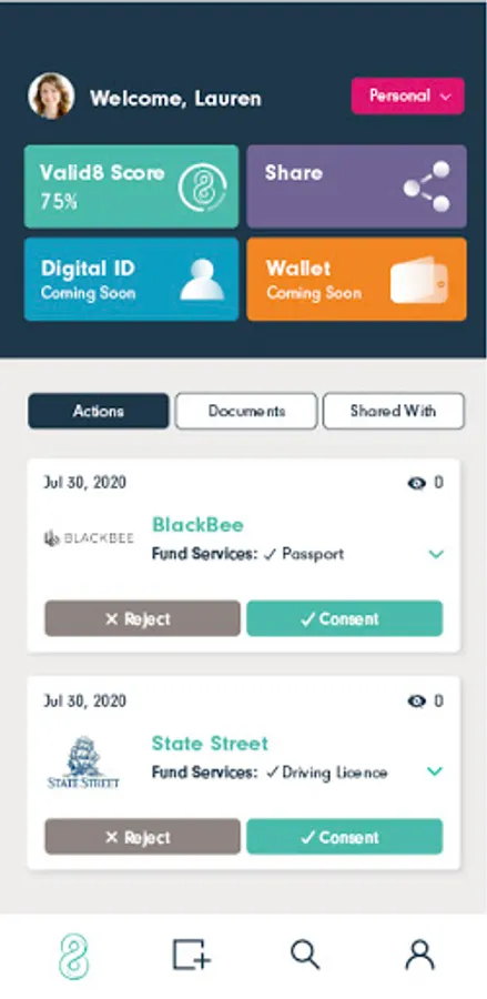 valid8Me is an easy way to securely share personal and corporate information for customer onboarding. valid8Me was created to revolutionize how we store and share our most sensitive information. Its purpose is to empower users to securely hold and instantly release key documents from one, personalized digital identity vault.