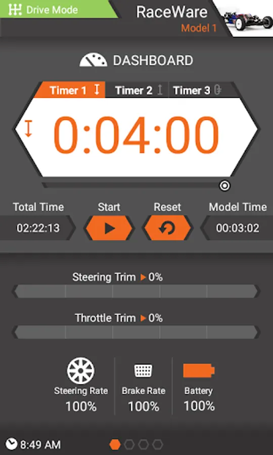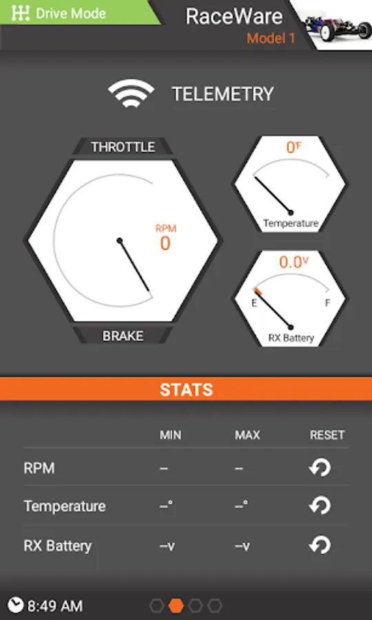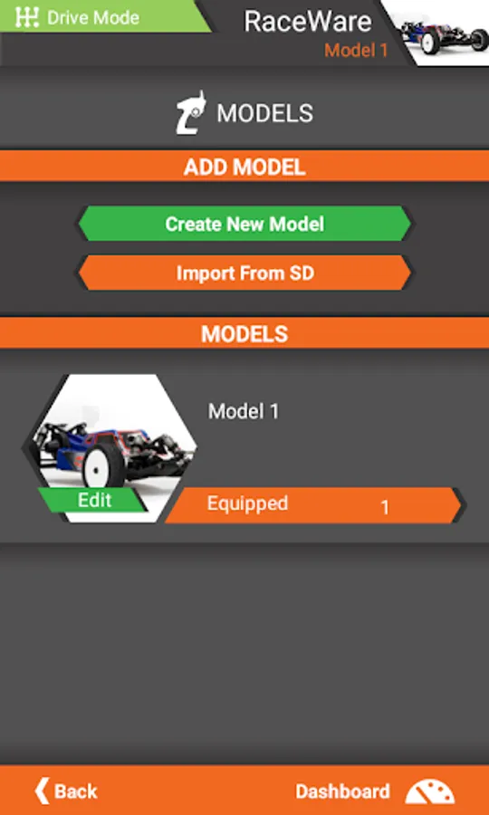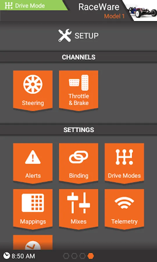 The Spektrum RaceWare™ application unlocks the programmability of your Spektrum DX6R and allows you to setup new models, monitor real-time telemetry data and much more. The intuitive interface allows you to easily manage all of vehicle using dedicated programming menus while providing the opportunity to customize the interface with color changes and the upload of images for each of your vehicles. Simply scroll to the correct screen to setup a new model, dial in an existing model or make advanced changes such as drive mode selection, customer steering curves and more. The RaceWare™ app allows you to dial in your vehicles performance and customize the interface using the following programming options;