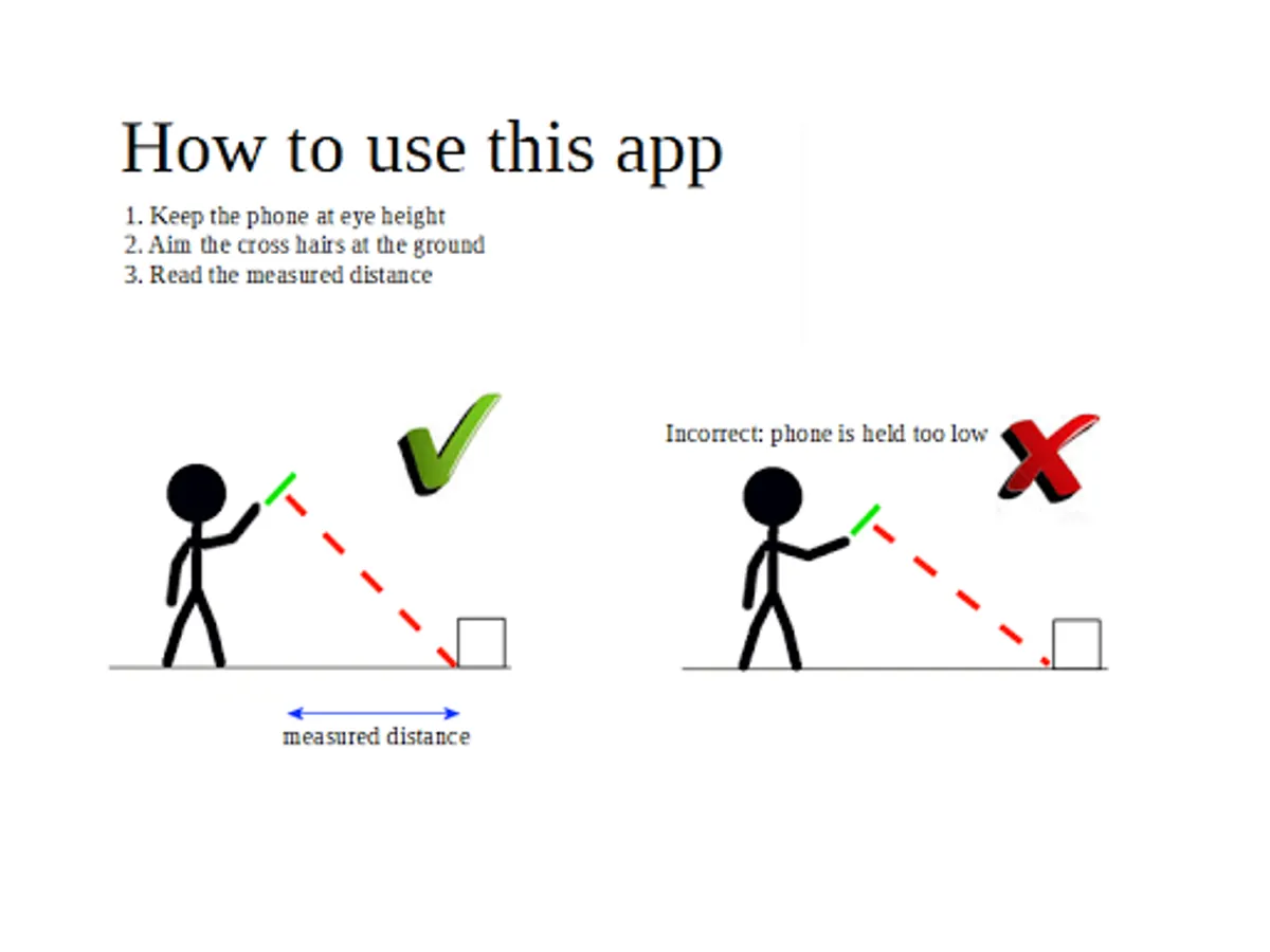 Simply hold the phone at eye level and align the cross hair on the ground at the point you want to measure. The phone will display a continuously updated horizontal distance from the camera to the point under the cross hair.