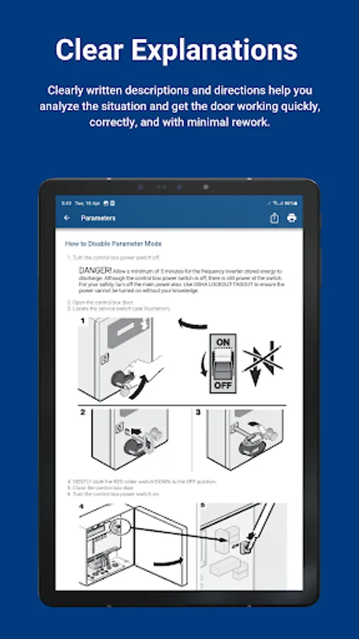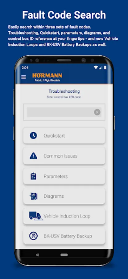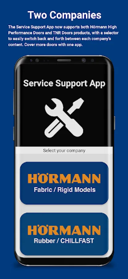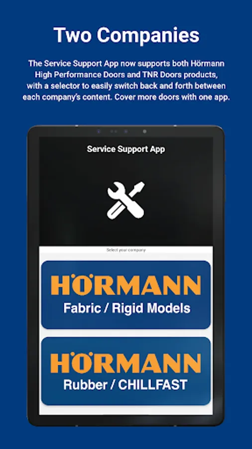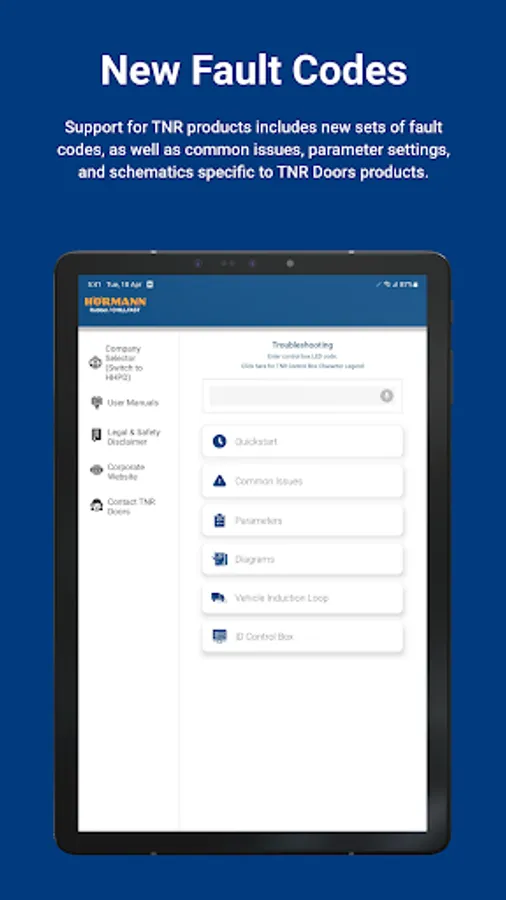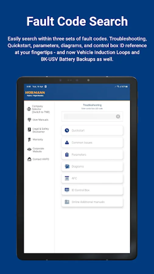 The Hörmann High Performance Doors/TNR Doors Service Support app provides trained Hörmann and TNR commercial door installers and service professionals with helpful installation and troubleshooting information, including searchable fault codes, parameter codes, quick start tips, common issues, schematics, and diagrams. It also provides quick access to online manuals and the help desk, all at the tips of your fingers.