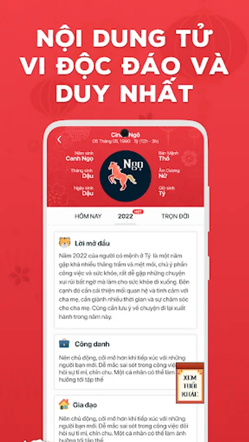 Especially, the contents of TU VI 2022 are ASSOCIATELY SUCCESSFULLY SUCCESSFUL in the field of horoscopes, so that the application brings users UNIQUE AND SPECIALIZED CONTENTS.