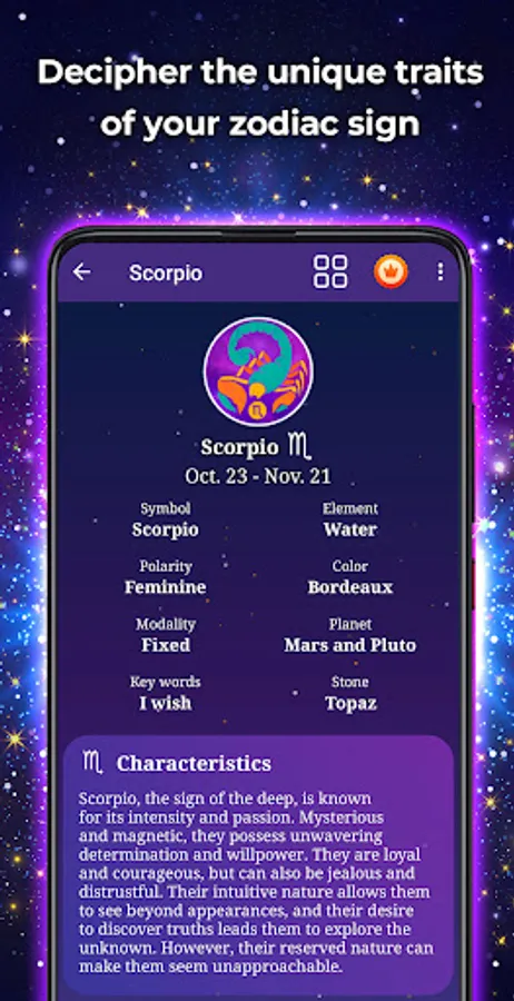 - Features and characteristics of the zodiac: You can consult whenever you want the characteristics of your zodiac sign, such as the element, color, mode, planet, stone or gem. As well as discover how the said zodiac in love, with your family, with money and work.
