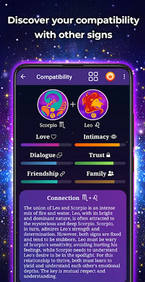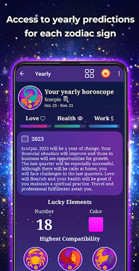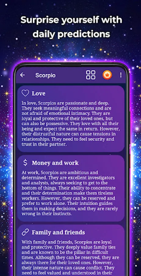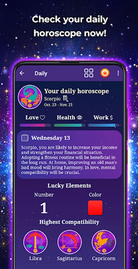 We want the experience to be as smooth as possible, so in the horoscope prediction we go to the point, to what matters: love, health, money, work and other important aspects.