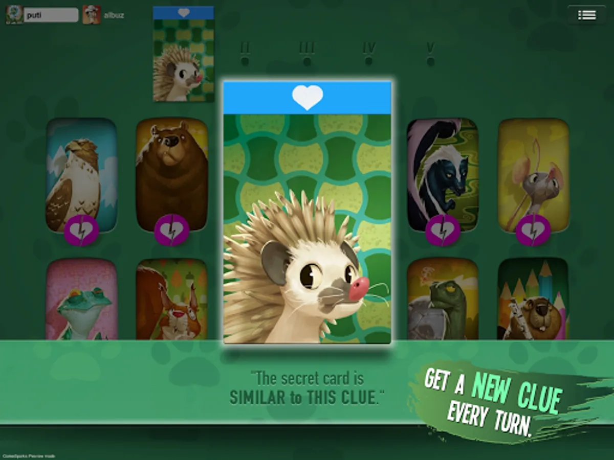 After each clue, the other players must discard 1 or more characters from the roster. If they discard the secret card, you all lose! But, if the secret card is the only one left, you all win!
