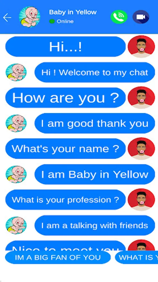 Video Call and Chat Yellow Baby is a message App where you can send any message and get a reply from the Yellow Baby. Chat with Yellow Baby is the unique feature of this prank app, which makes it the best in the prank calling Apps. in yellow fake calling Baby and chatting app are straightforward to use, and anyone can use it for fun purposes.