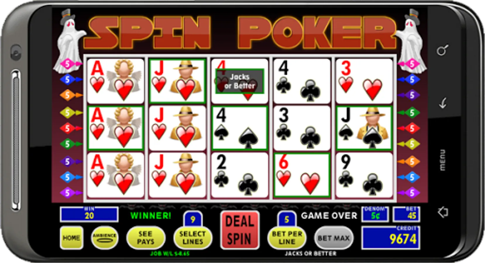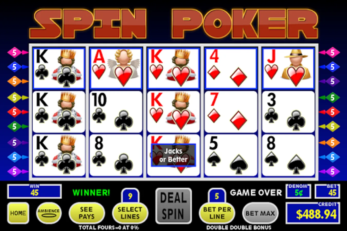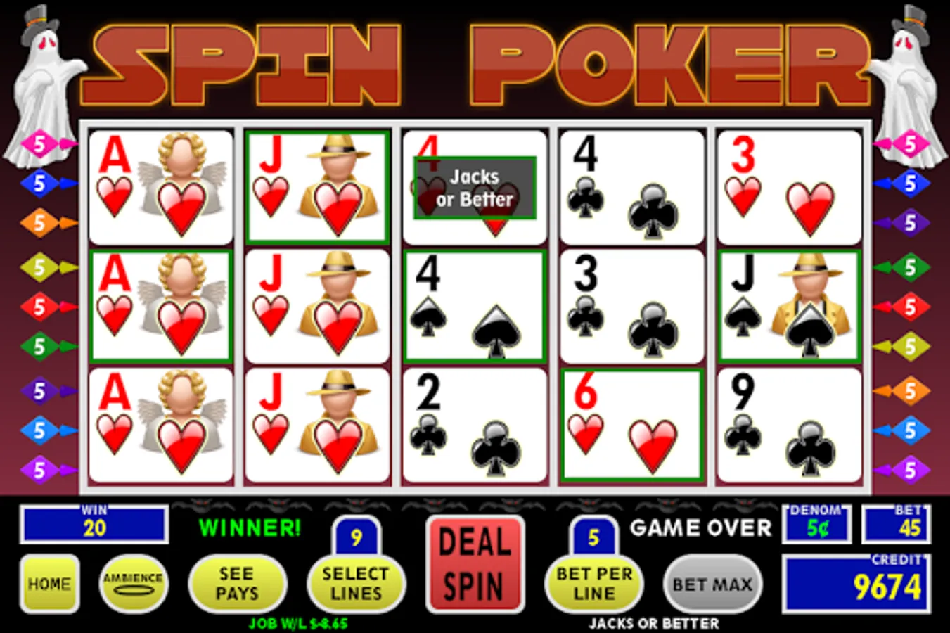 Feel the excitement of a true casino environment with Spin Poker, where Video Poker and Slots get combined so you can play up to 9-lines at once for ultimate payouts. Included is 3 game variations that all poker pros play; Jacks Or Better, Double Double Bonus and Triple Double Bonus. This is an incredibly fun game for Video Poker players.