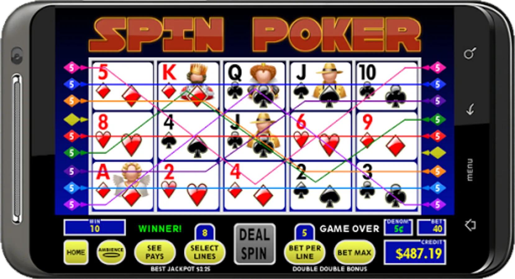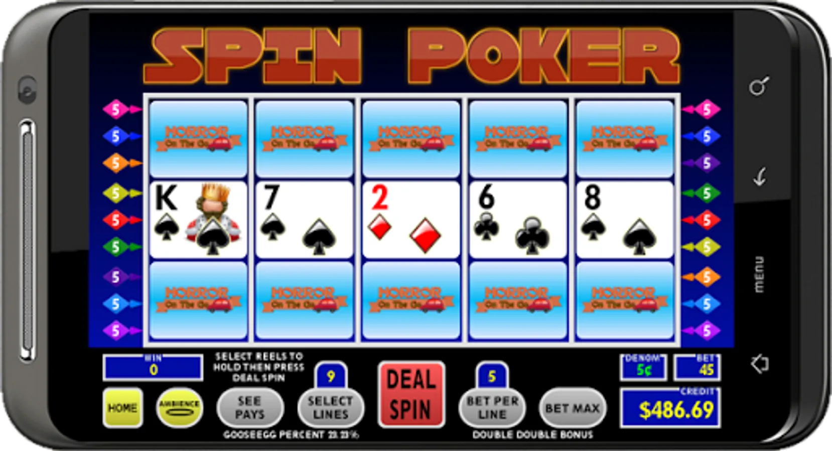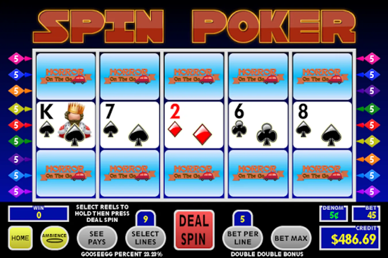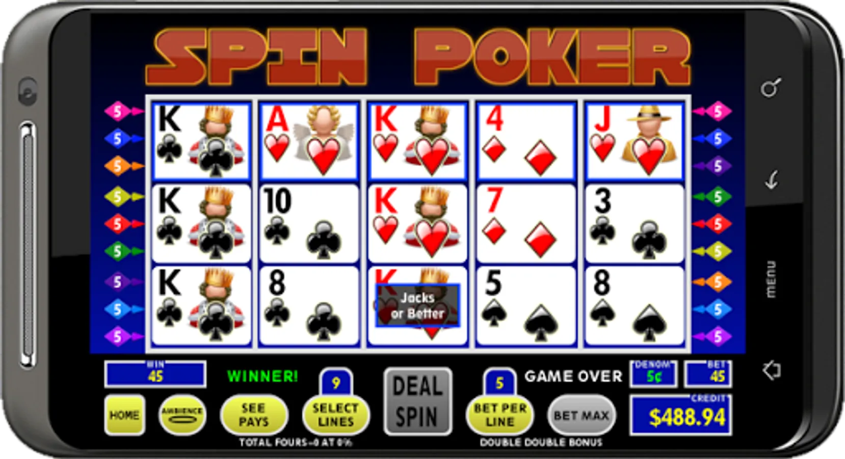 Feel the excitement of a true casino environment with Spin Poker, where Video Poker and Slots get combined so you can play up to 9-lines at once for ultimate payouts. Included is 3 game variations that all poker pros play; Jacks Or Better, Double Double Bonus and Triple Double Bonus. This is an incredibly fun game for Video Poker players.