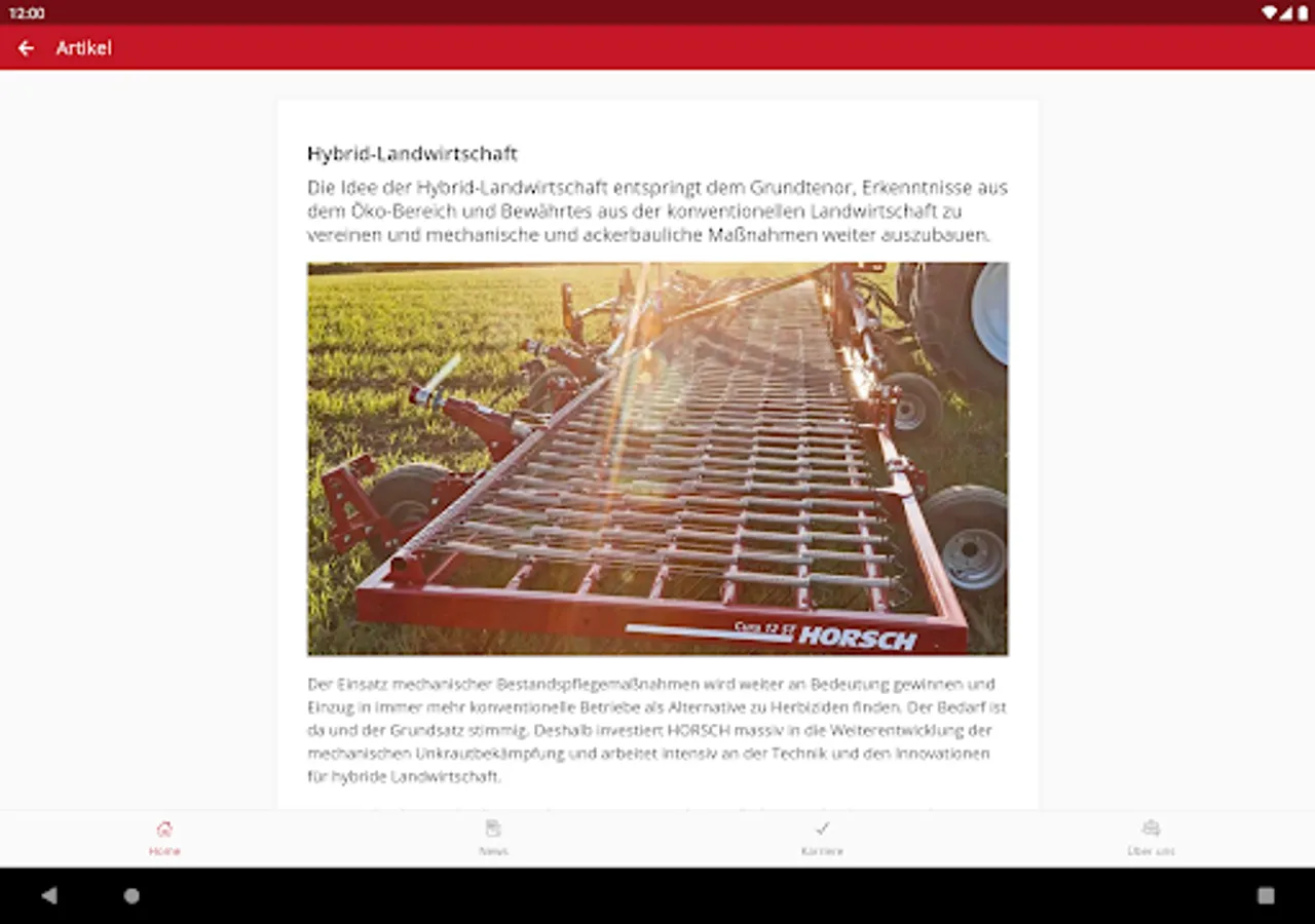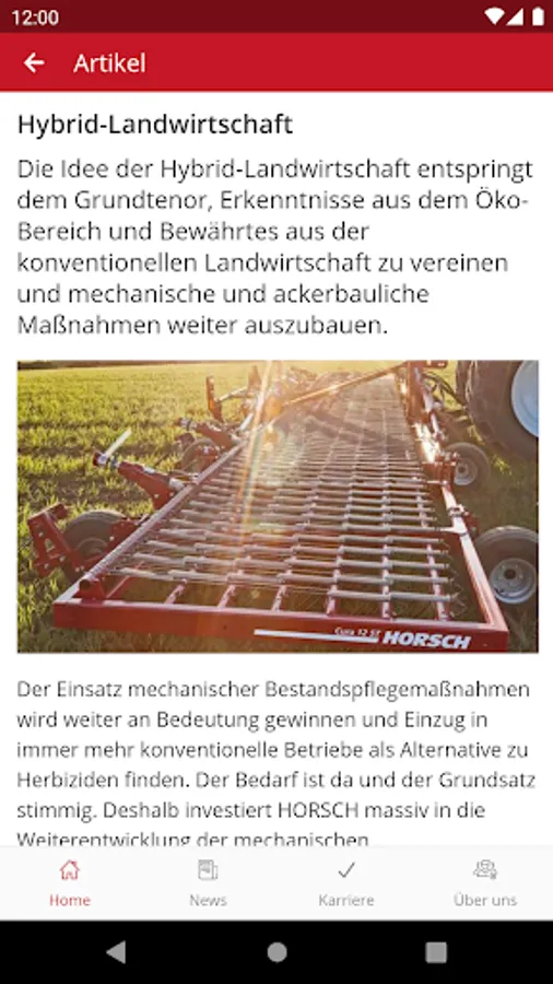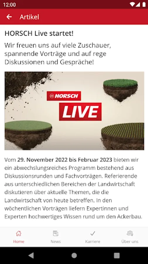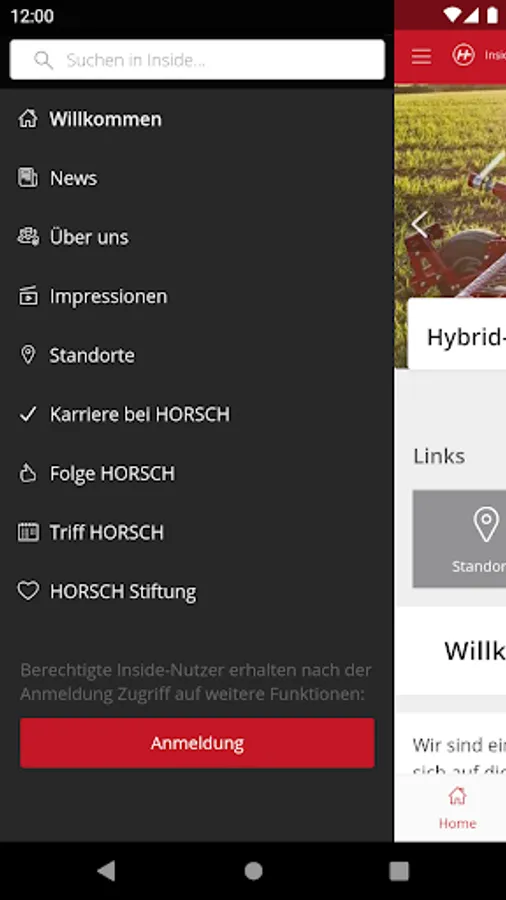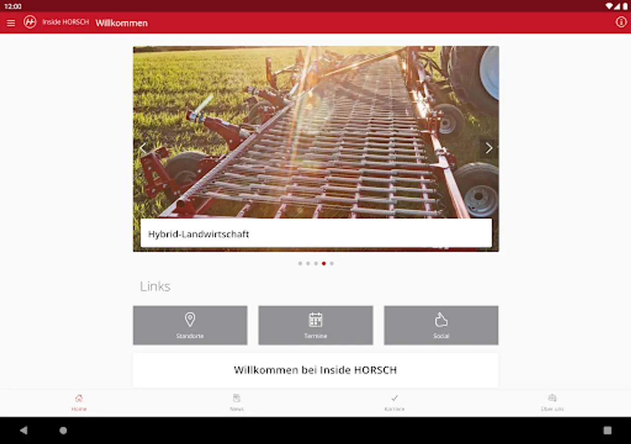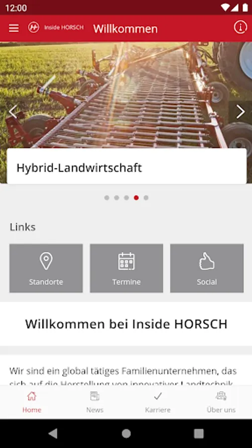 Inside HORSCH, as HORSCH's central information and communication app, offers not only the latest news and social media feeds but also general information about the company, an overview of our locations and an event calendar. Get a glimpse behind the scenes and learn everything about HORSCH as an employer and the career opportunities with us. With Inside HORSCH you are up to date around the clock and have all information at hand quickly and mobile! Push notifications help you not to miss anything. Any questions? Then get in touch with us