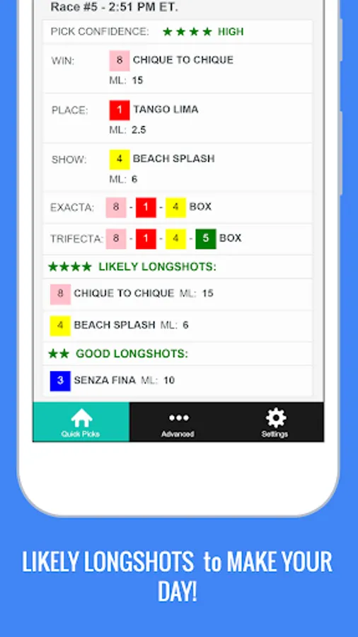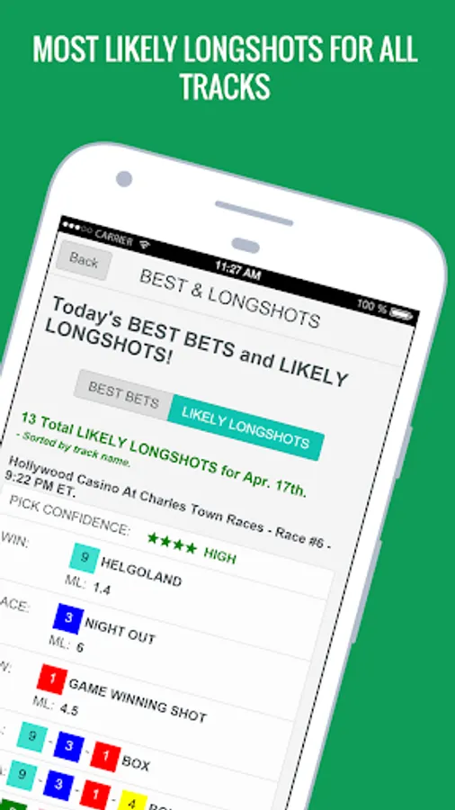Looking for high risk and high reward wagers? The Longshots of the Day feature has you covered. These are horses that the algorithms spots as having a chance to win or at least hit the board, come in first, second, or third AND they have morning line odds of 8-1 or better. It only takes one of these longshots bomb picks to hit for you to cash BIG money!