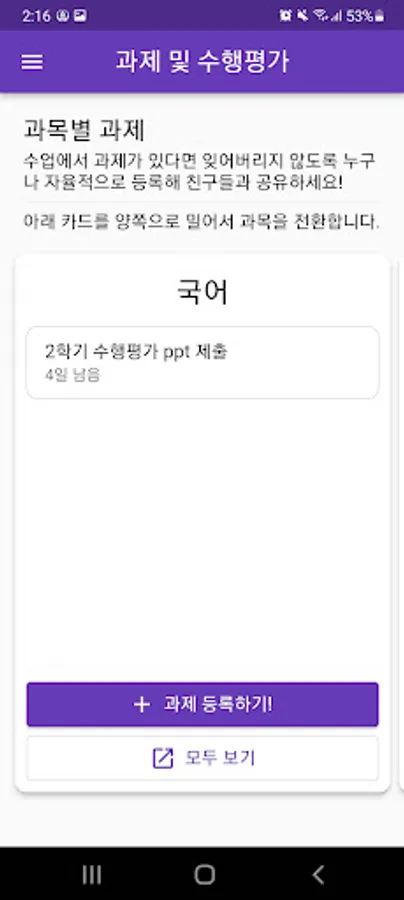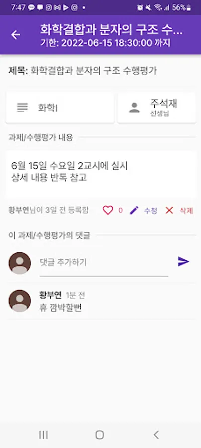 When there is a task or performance evaluation, I forget about it and get rid of it the day before the deadline. You can voluntarily register assignments and performance evaluations that occurred during class, share them with your classmates, and receive notifications so you don't forget them!