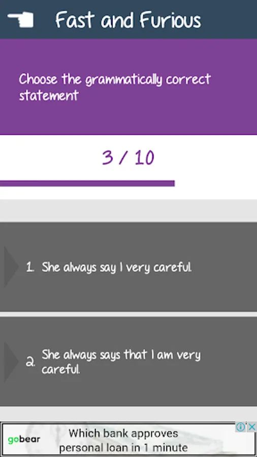 English grammar is the way in which meanings are encoded into wordings in the English language. This includes the structure of words, phrases, clauses, and sentences, right up to the structure of whole texts. It is important to speak and write grammatically correct English that is universally understood. The motivation behind this quiz app is for you to practice your English grammar regularly while on the go. We believe you can learn better by practicing rather than just studying grammar rules. The quiz is designed such that each session takes no more than a minute to complete thus you can easily find time to play it even while commuting.