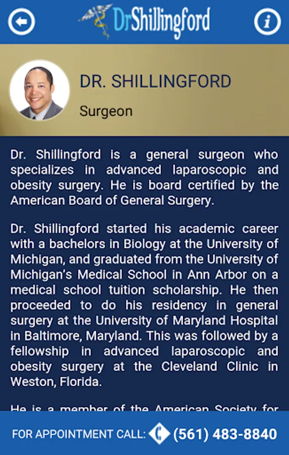 Dr. Shillingford started his academic career with a bachelors in Biology at the University of Michigan, and graduated from the University of Michigan’s Medical School in Ann Arbor on a medical school tuition scholarship. He then proceeded to do his residency in general surgery at the University of Maryland Hospital in Baltimore, Maryland. This was followed by a fellowship in advanced laparoscopic and obesity surgery at the Cleveland Clinic in Weston, Florida.