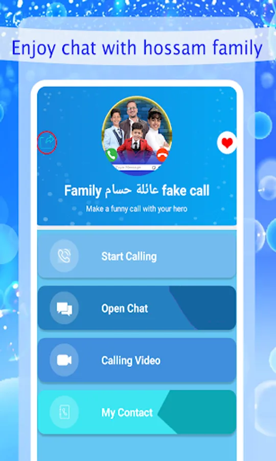 يوم يمكنك مزحة أصدقائك والمزاح معهم ، اتصل بمكالمة عائلة حسام الوهمية من خلال النقر على زر الدردشة الوهمية واستمتع مع أصدقائك.