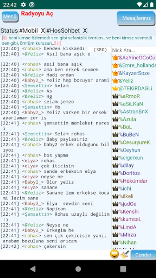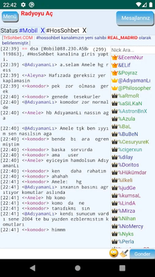 Launched in 1999 as an alternative to the heavily loaded networks of the time, HosSohbet.Com has grown into a live chat community of 1,700 people. IRC, ie Internet Relay Chat, is the short spelling of the initials of the words. It was invented in 1988 by Jarkko Oikarinen and recognized as the best FRIENDLY Chat Rooms of their network. HosSohbet.Com has pioneered Free Chat by giving users such channels, removing their nicknames and giving them the right and ability to manage their online experiences without fear of impersonating or harassment.