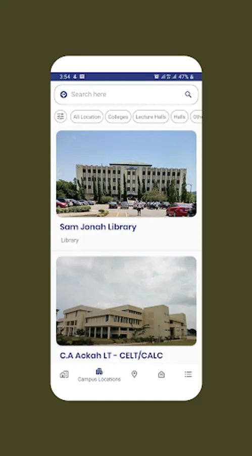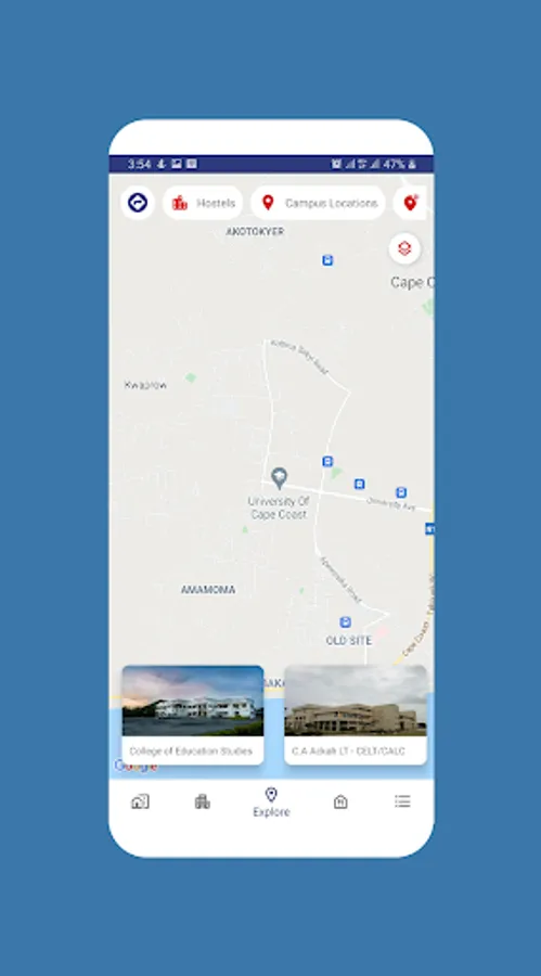 The main aim of this app is to make navigation easy for students while on the University of Cape Coast Campus. Students can login into their online student portal and visit the official UCC website as well. This app provides a list of locations on campus such as: