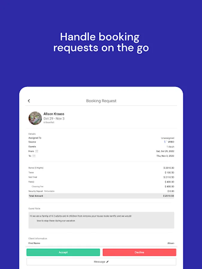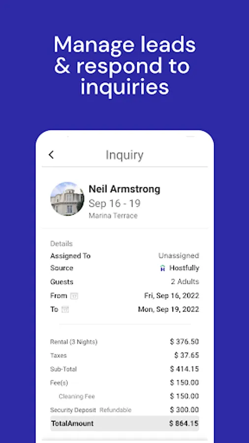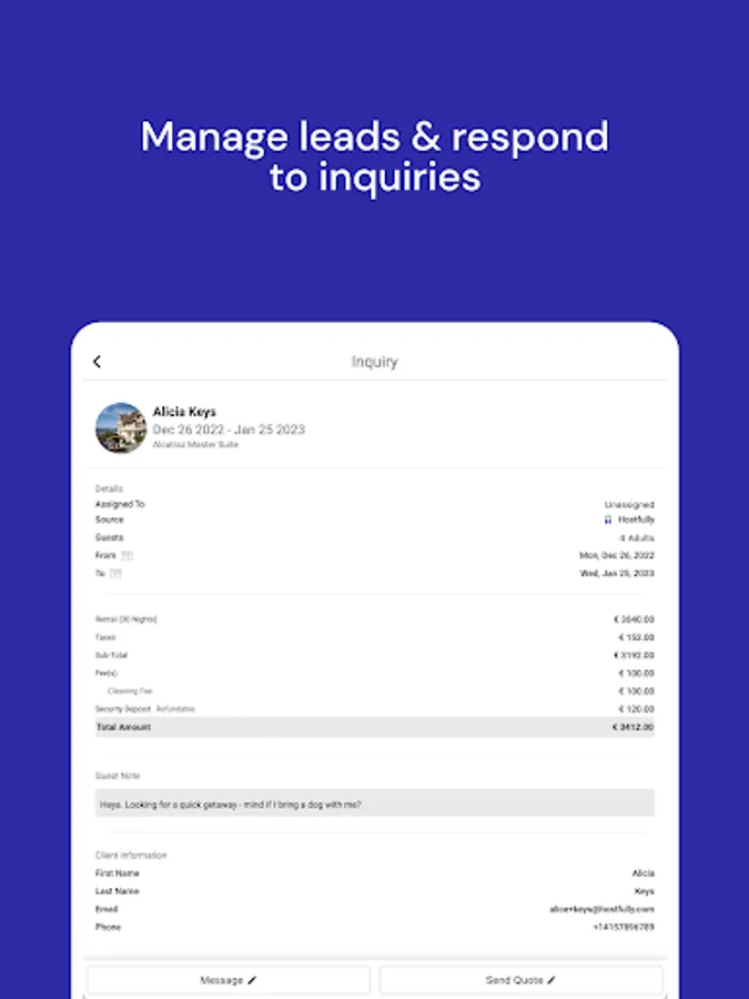 - Mobile Dashboard: Leave the office without worrying about dropped leads. Review incoming reservation requests, chat with leads, and track check-ins and check-outs.