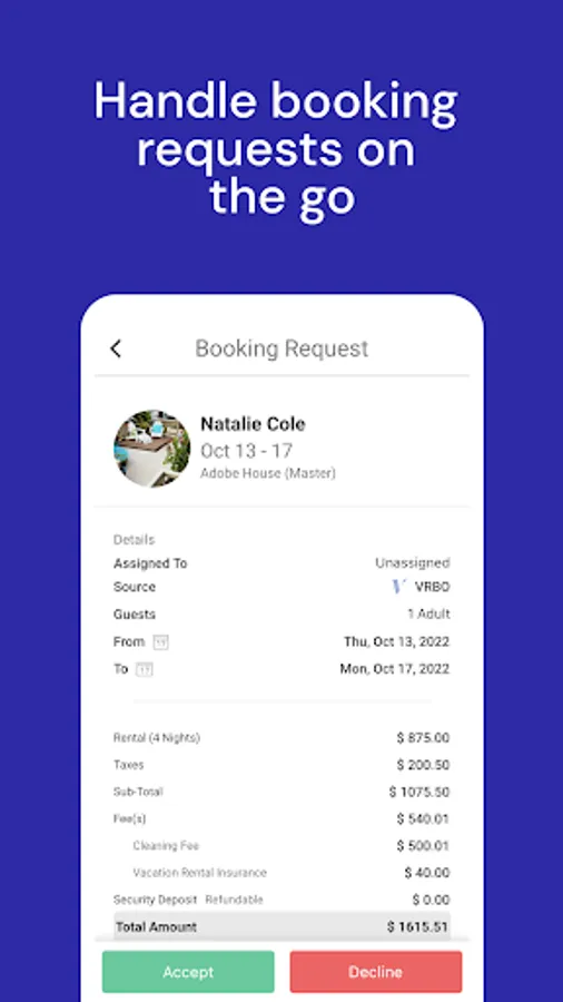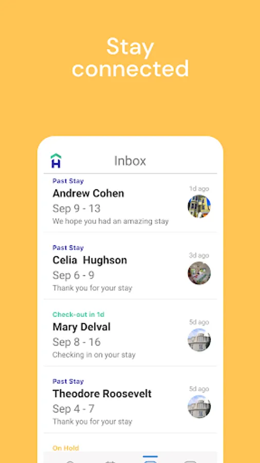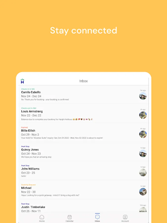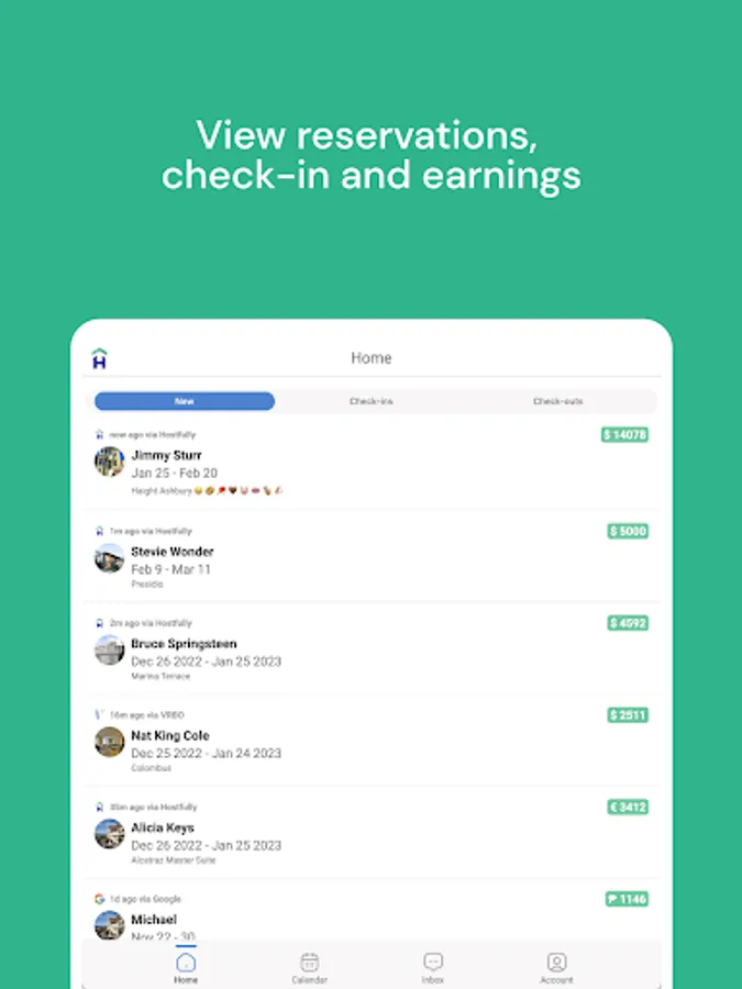 - Central Calendar: Get a snapshot of your reservations in a flash. Tap on any reservation to see the guest's name, price breakdown, and stay details. Quickly switch to the Inbox with another tap.