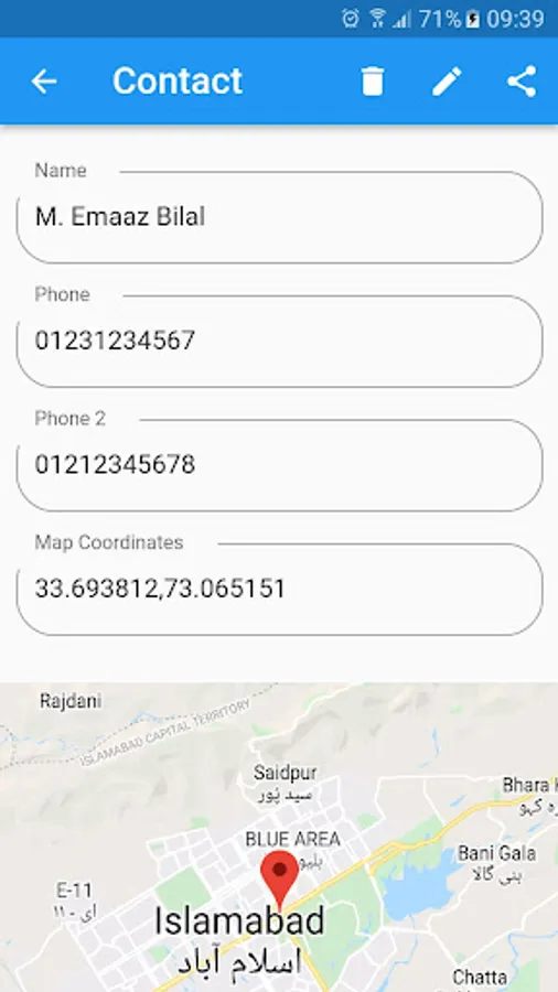 This app allows the users to manage contacts on his/her device and allows him/her to save the contact's location along with name and phone numbers. The user can share the saved contact with other applications also.