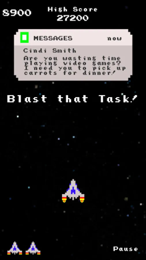 Task Attack is a humorous, classic shoot em up style game with a twist. Drawing inspiration from classic 80's arcade games, players first encounter attacking alien invaders, but soon must fend off “real life” interruptions that creep into the game and join the assault. To successfully defend the galaxy, players must defeat trips to the store, car repairs, news alerts, and other annoying distractions. Do you have what it takes to survive a Task Attack?