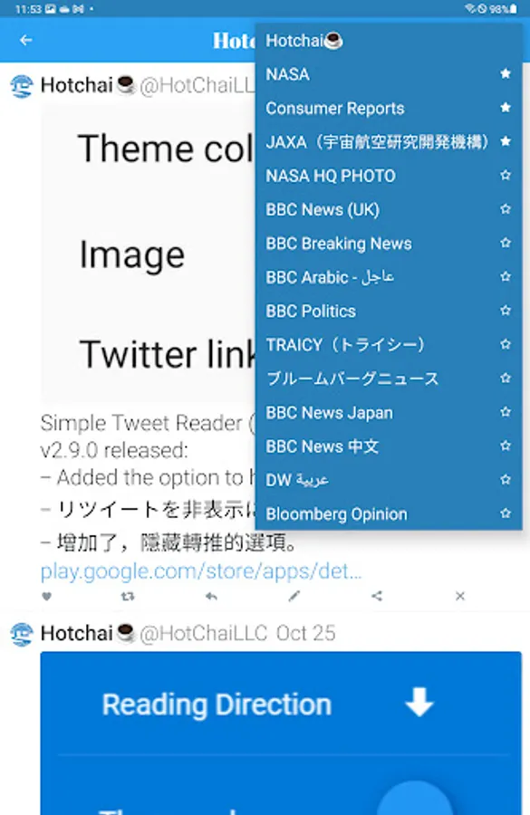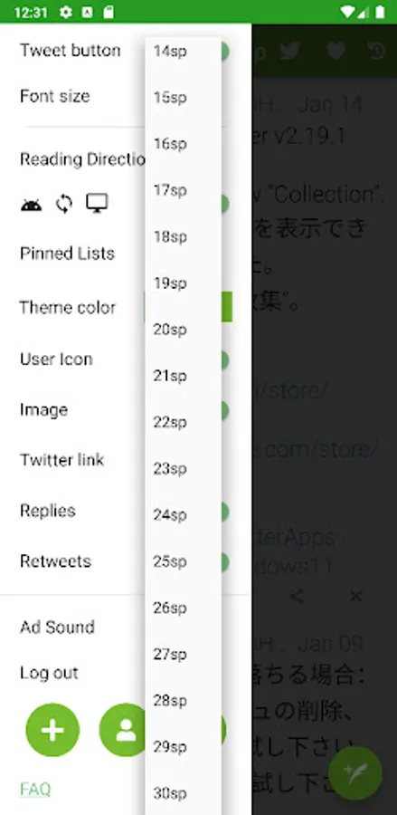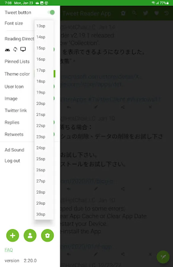 Swipe to the right from the left edge of the screen, then you can change 'Font Size', 'Theme Color' or 'Reading Direction'. And you can 'Hide Image/Video' attached to tweets. You can hide 'Retweets', too.