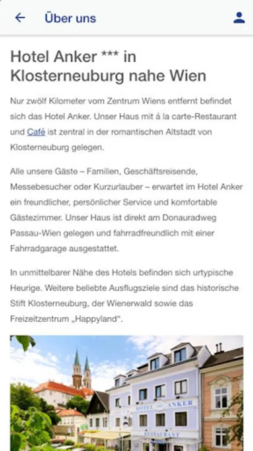Welcome to the official app of Hotel Anker in Klosterneuburg! Here you will learn everything about our hotel and our cafe-restaurant. Use our bonus card for hotel services or give us your feedback directly via the app. If you have a request, we look forward to receiving your request via the inquiry form!