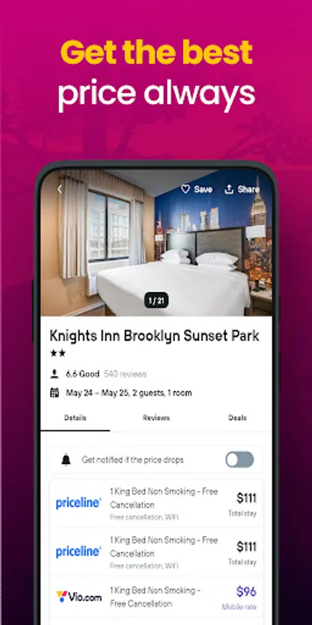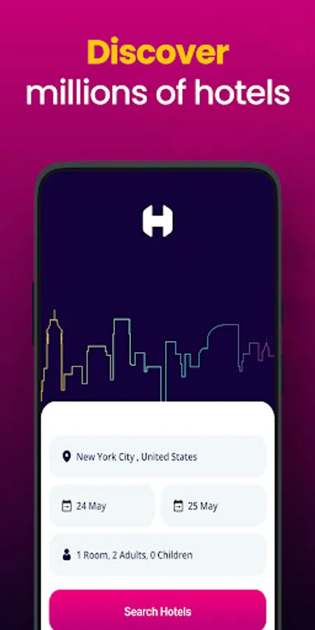 Our app contains all major hotel booking companies and hotel chains such as Marriott bonvoy, Hilton hotels, Ihg, Hyatt hotels, Hampton inn, Wyndham, Motel 6, Drury hotels, Radisson hotels, Accor, Extended stay america, Melia, Choice hotels, Best western, La quinta hotel, Holiday inn express, Riu hotels resorts, Red roof inn, Sheraton hotels, etc. making it easier to find cheap hotels online.