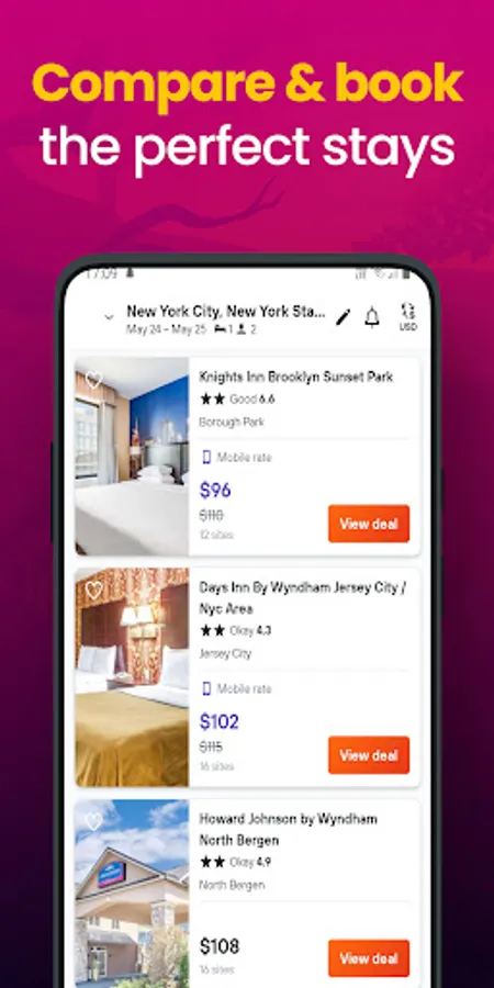 Cheap Hotel booking app helps you to compare and book rooms at the lowest price online on a single click. Our hotel app provides the latest cheap hotel deals by comparing major hotel booking providers like Airbnb, Vrbo vacation rentals, Expedia, booking com, Hotels com, Priceline com, Trip advisor, Trivago, Cheap hotels, Snaptravel, Hoteltonight, Agoda com, & many more.