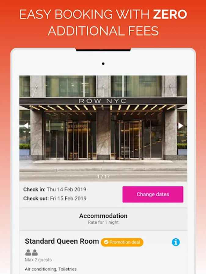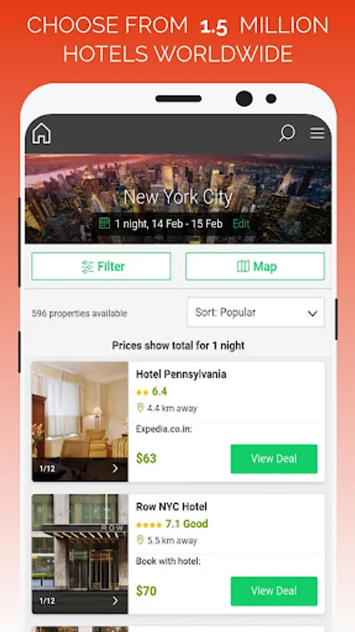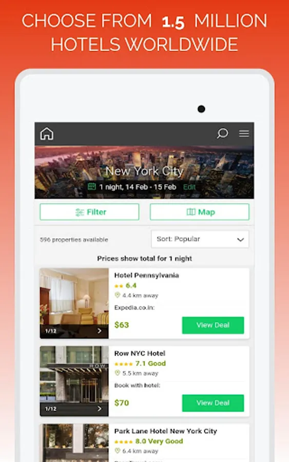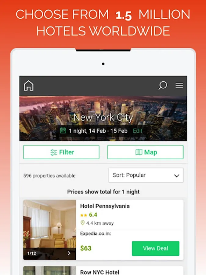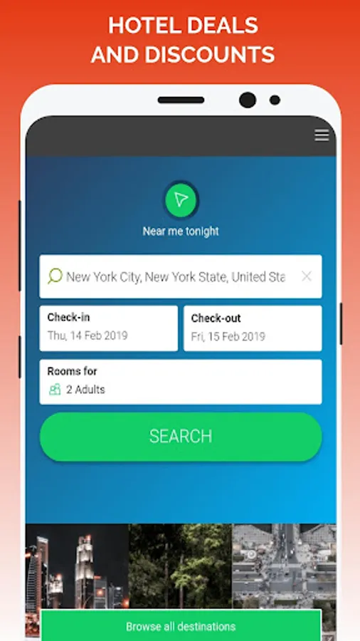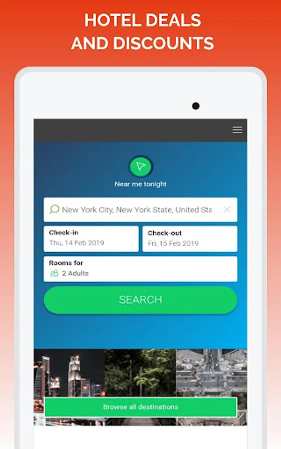 Hotel discounts app helps users to find cheap hotels available globally by comparing hotel reservation prices on multiple online travel agencies and hotel network websites. We will provide you best hostels, apartments, bnbs, resorts on popular travel destinations, vacation rentals, motels and all other kinds of stays. We always find you the best discount and you will get up to 50% offer on each booking. We compare hotel fare among world travel leaders such as priceline, hotwire, oyo, agoda, homeaway, yatra, kayak, momondo, trip com, hostelworld, travelzoo, flixbus, omio, rehlat, hrs, ihg, Holidayinn, Taj hotels, musafir, trivago, orbitz, vrbo, tripadvisor and much more. We can guarantee you the cheapest price online on most of your bookings.