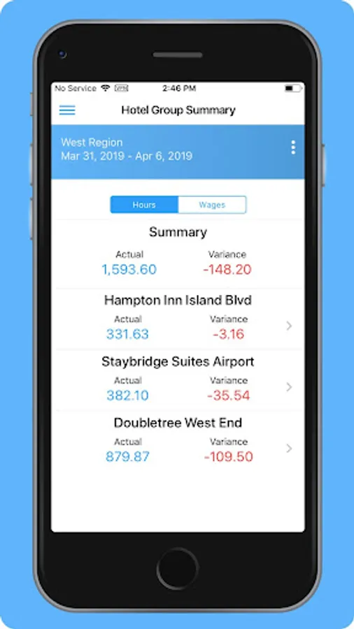 View a snapshot of labor win/loss by hotel in hours or wages. You can drill into any day to view the details by position for that hotel.