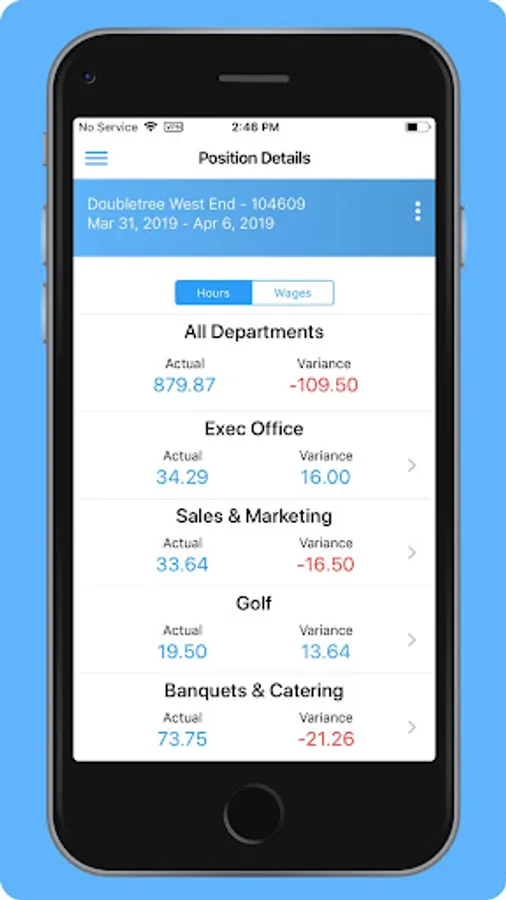 View a snapshot of labor win/loss by department in hours or wages for a given hotel. You can drill into any day to view the details by position along with all employees and their hours.