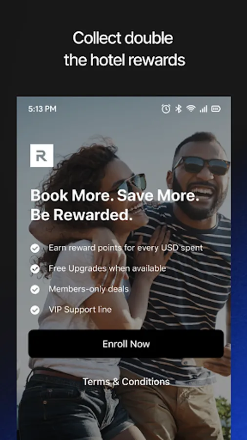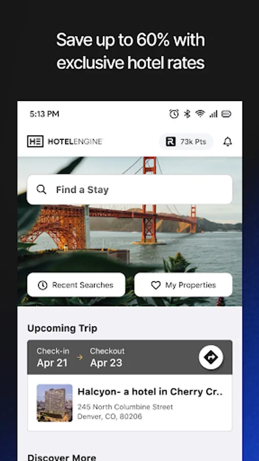 Double up on hotel rewards. Earn Hotel Engine Rewards on every booking, redeemable for hotel discounts and free nights. Plus, earn additional points for 15+ top hotel loyalty programs (like Marriott Bonvoy, Hilton Honors, IHG Rewards and more) when you book eligible rooms.