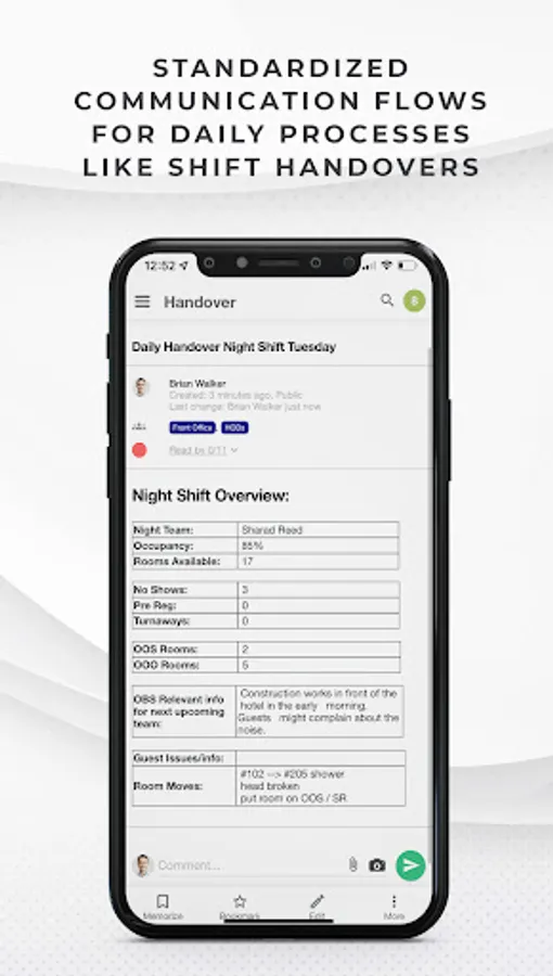 The transparent internal communication and centralized documentation of hotel knowledge ensures that daily shift handovers, tasks, checklists, repair jobs as well as guest requests are dealt with in an efficient and structured manner.