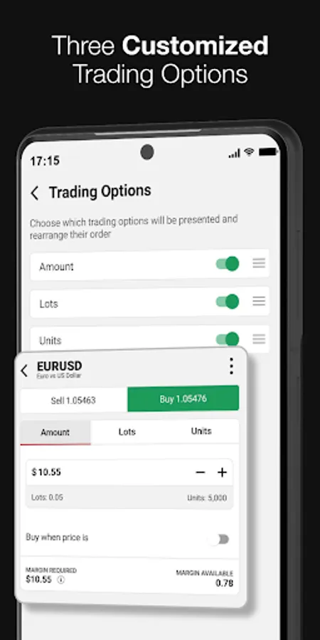 • Customized trading: place your trades easily and flexibly in amount, lots or units