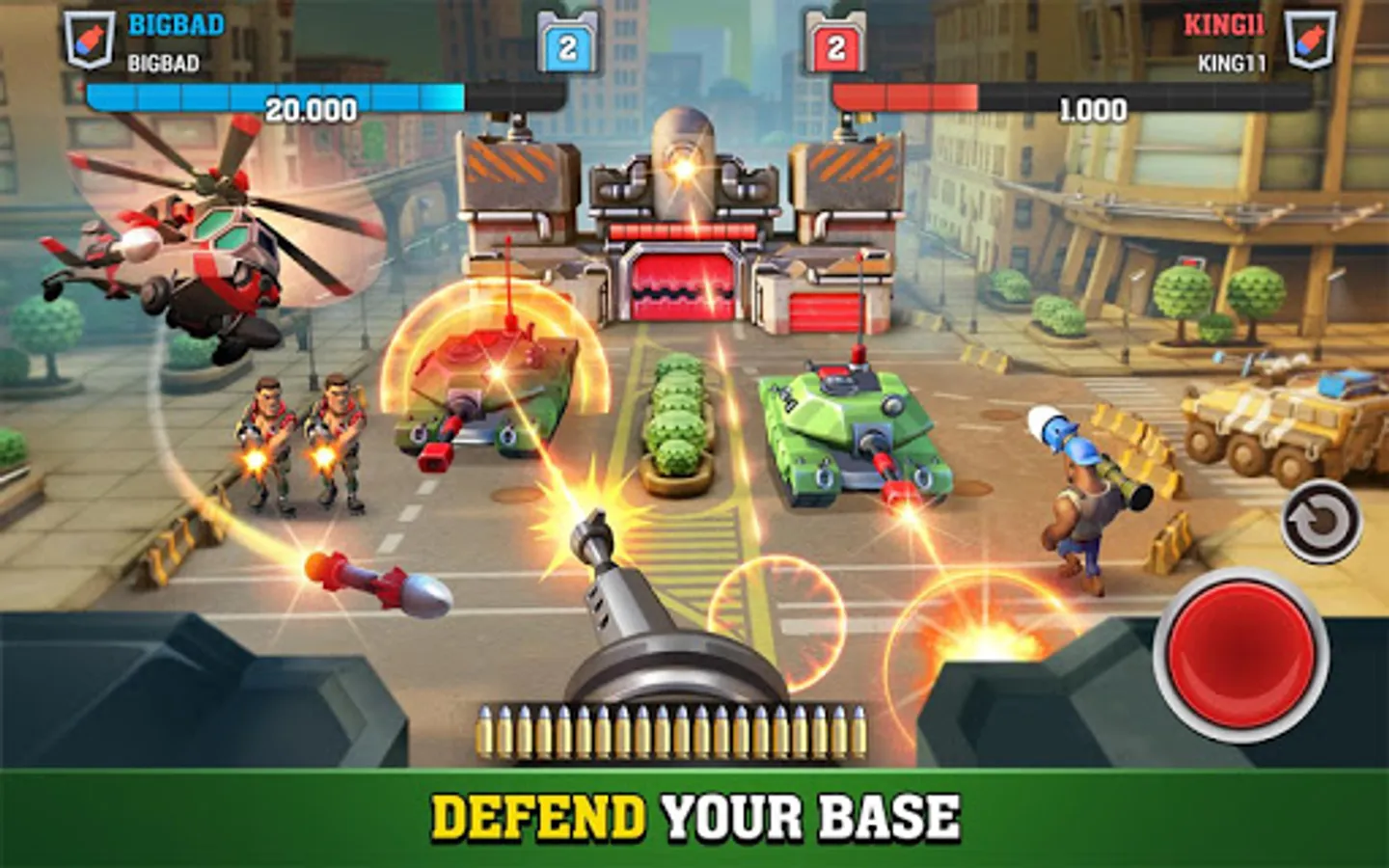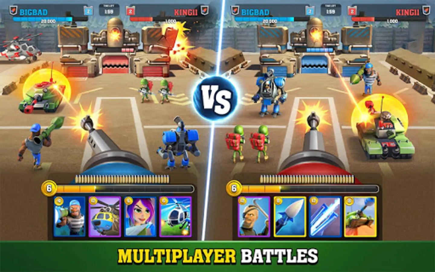 Mighty Battles is a world-class free-to-play pvp game. Your goal is to DESTROY the enemy bases by SHOOT down the opposition units AND tower base. Deploy your squad of ARMY SOLDIERS, TANKS, VEHICLES, WEAPONS AND BASE DEFENSES to attack and counter.